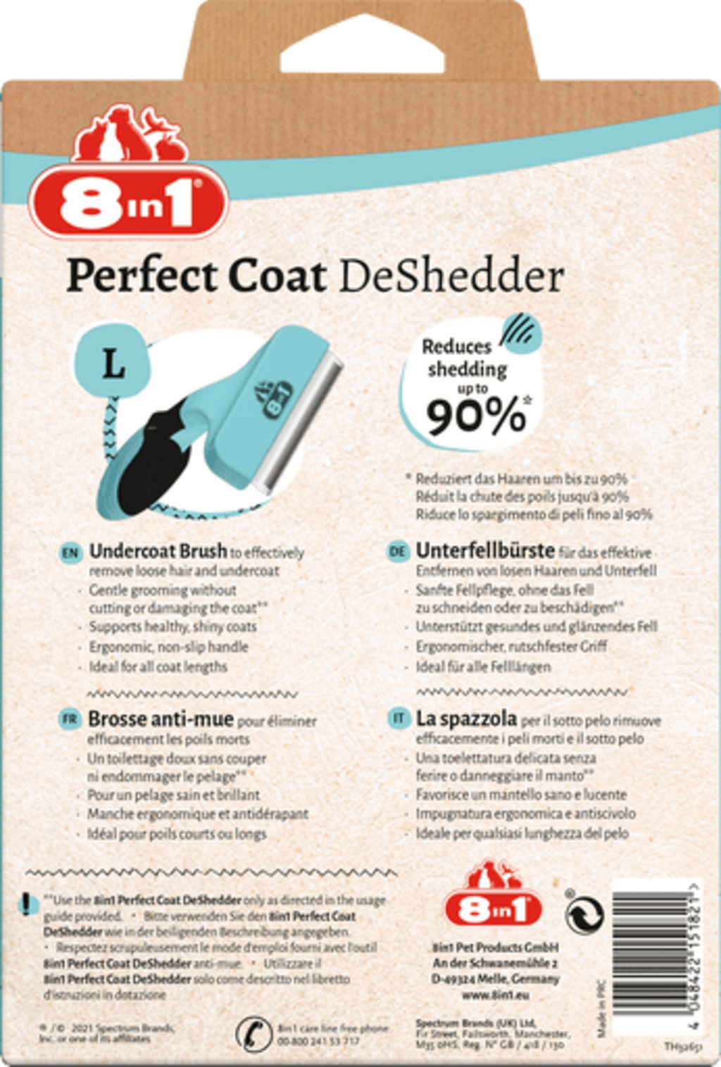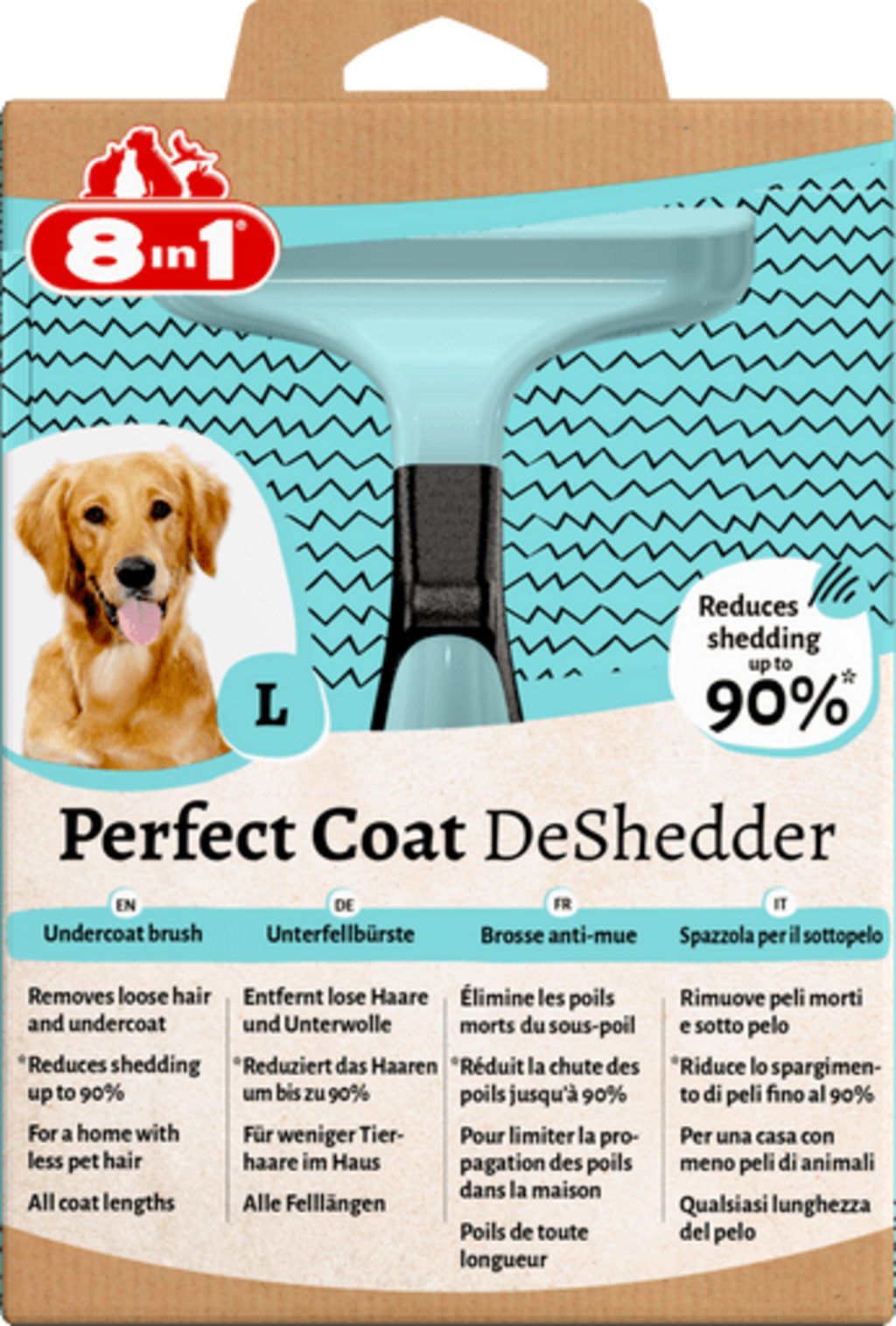 8in1 Perfect Coat DeShedder je krtača proti izpadanju za nego dlake psov vseh pasem. Medtem ko učinkovito odstranjuje odmrlo dlako in poddlako vašega ljubljenčka, zagotavlja sijaj in celo zmanjša izpadanje dlake do 90 %.