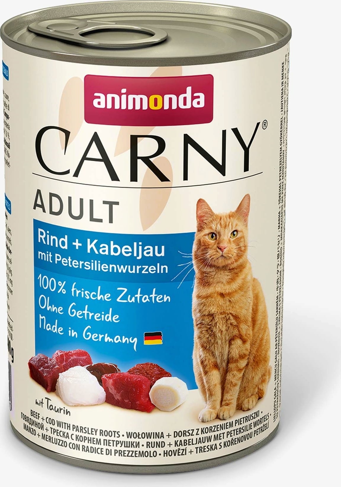 Mokra hrana Carny Adult vsebuje okusno govedino, polenovko in peteršiljevo korenino. Hrana je zasnovana posebej za potrebe odraslih mačk in združuje čudovito mešanico mesa in rib. Izdelek vsebuje naravne sestavine brez žit, soje, sladkorja, umetnih barvil in konzervansov. Hrana vsebuje vsa vitalna hranila in aminokislino tavrin, ki trajnostno podpira presnovo in prebavo.