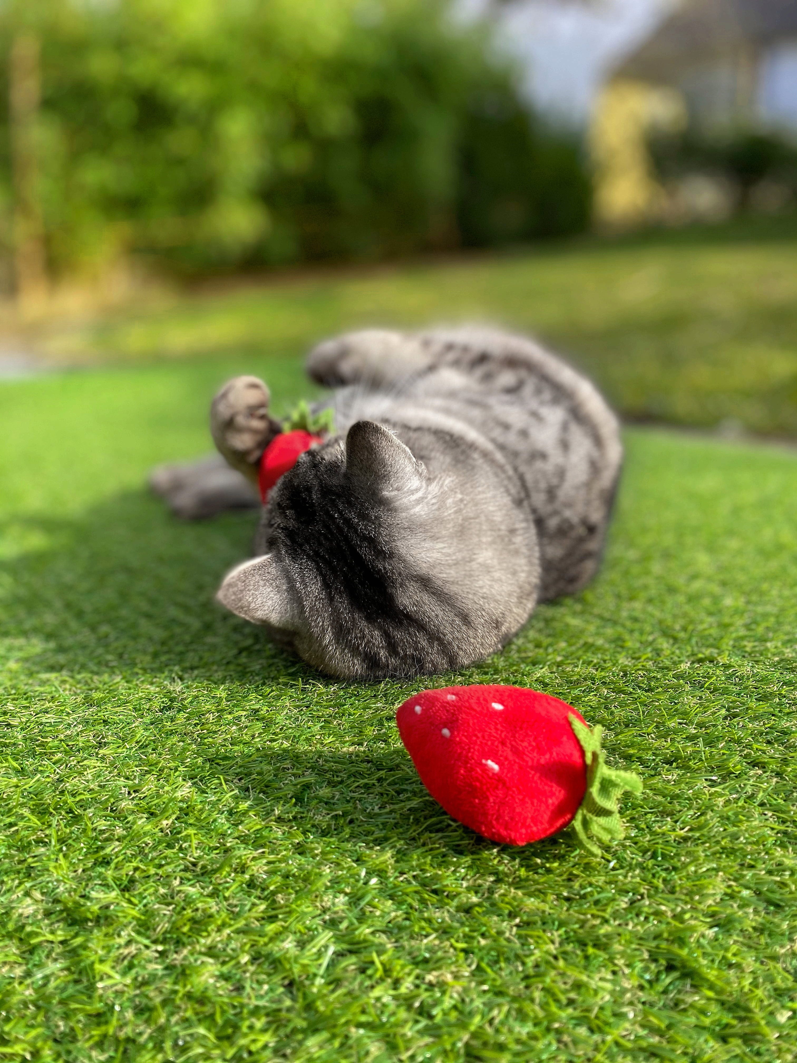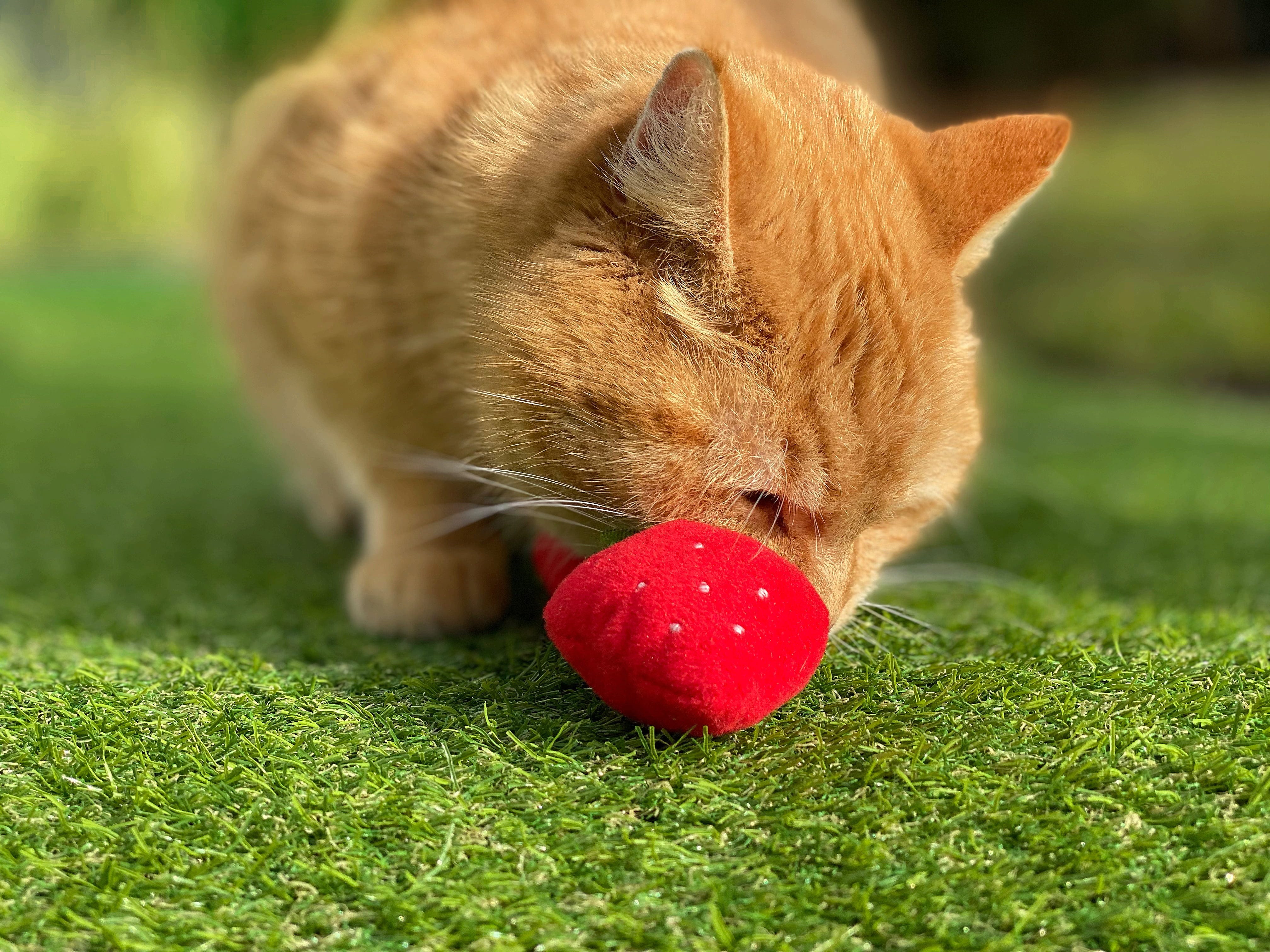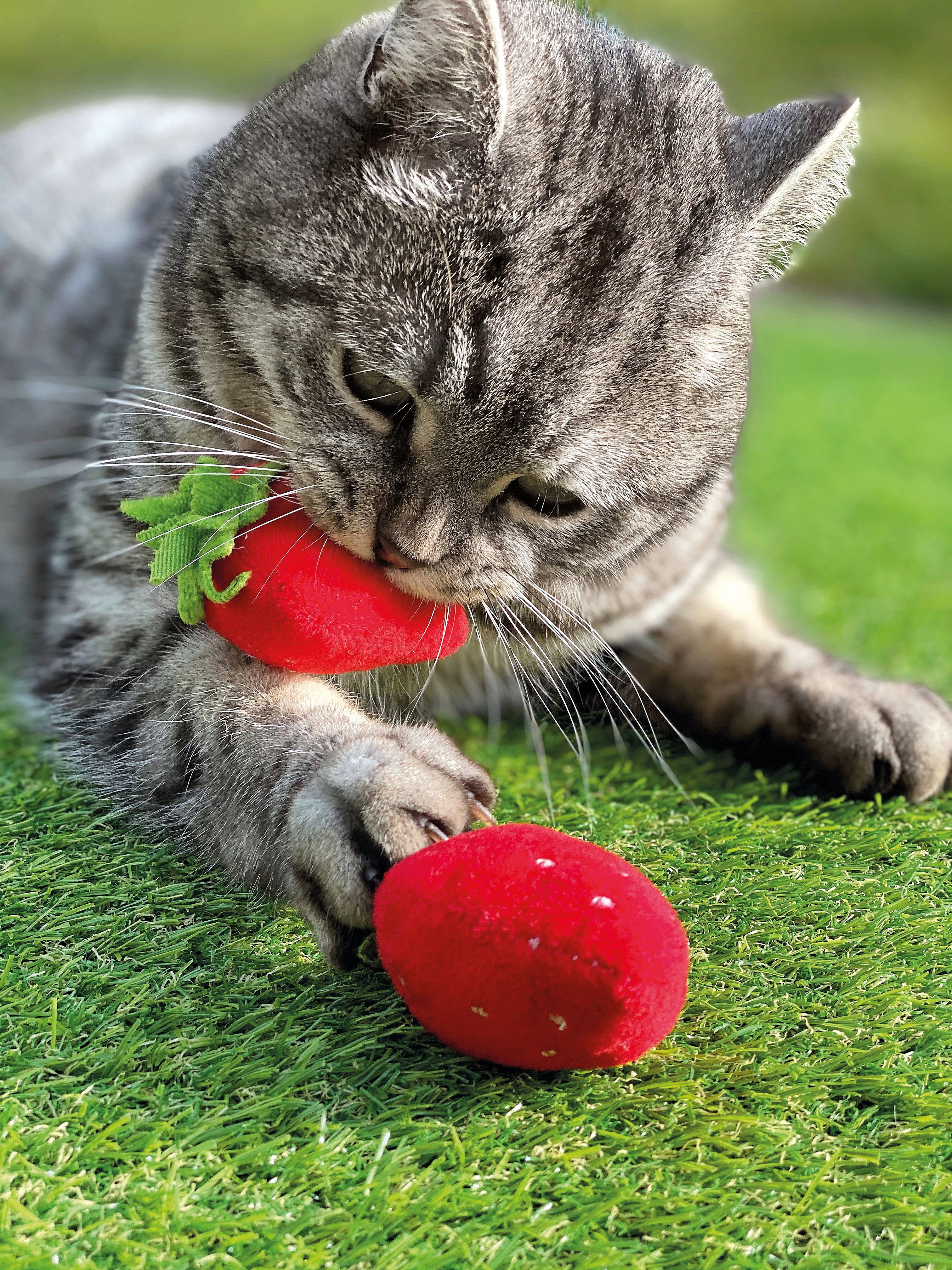 Najslajše sadje za vašo mačko! Te jagode ne navdušujejo le s svojo prikupno obliko, temveč tudi z vsebino: polnilo iz mačje mete in rastline silver vine je za igrive mačke preprosto neustavljivo.