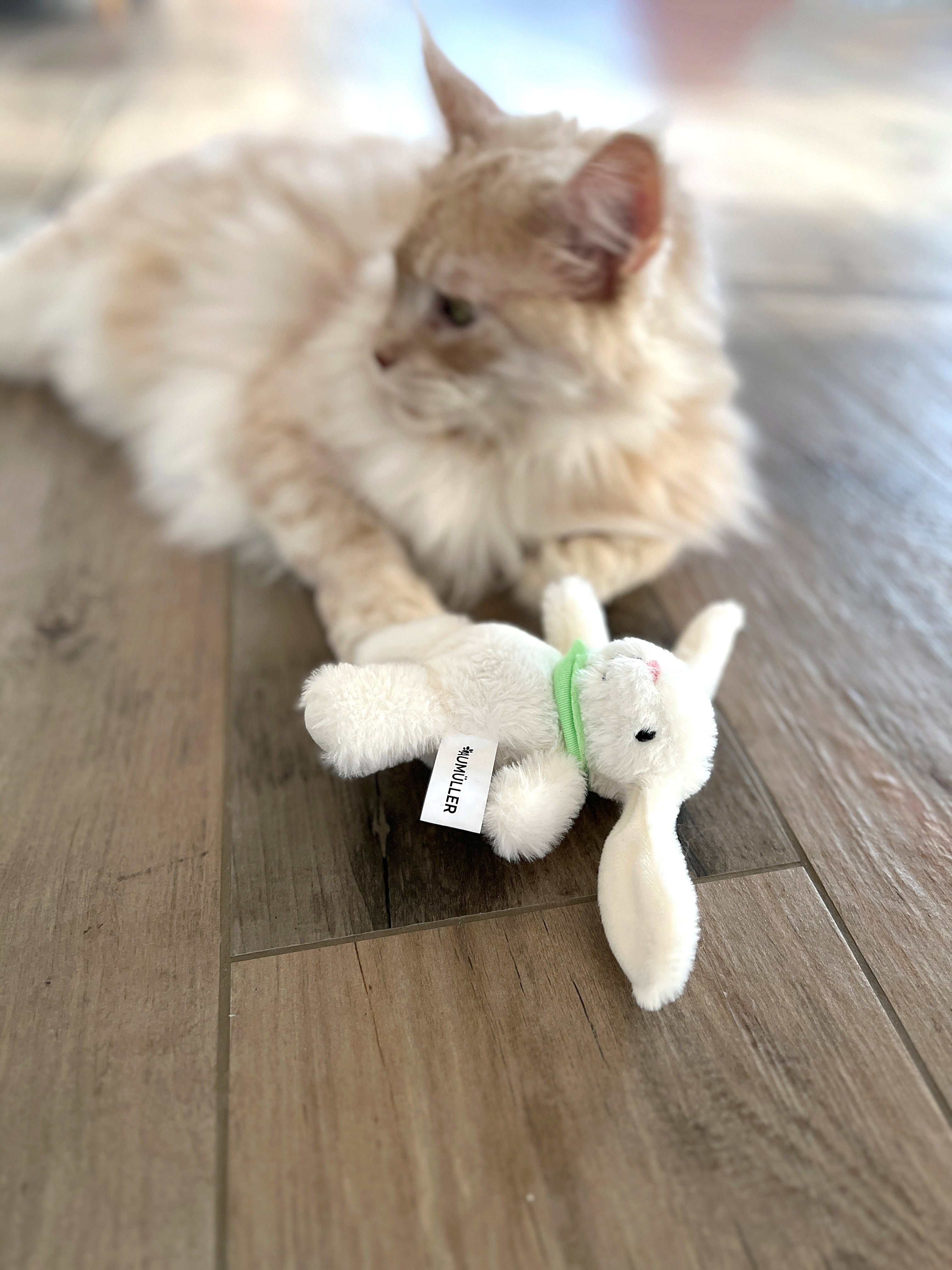 Izkušnenj v jeziku slovenščina za izdelek Aumüller Mačja igrača - plišasti zajec Harry z zeleno rutko