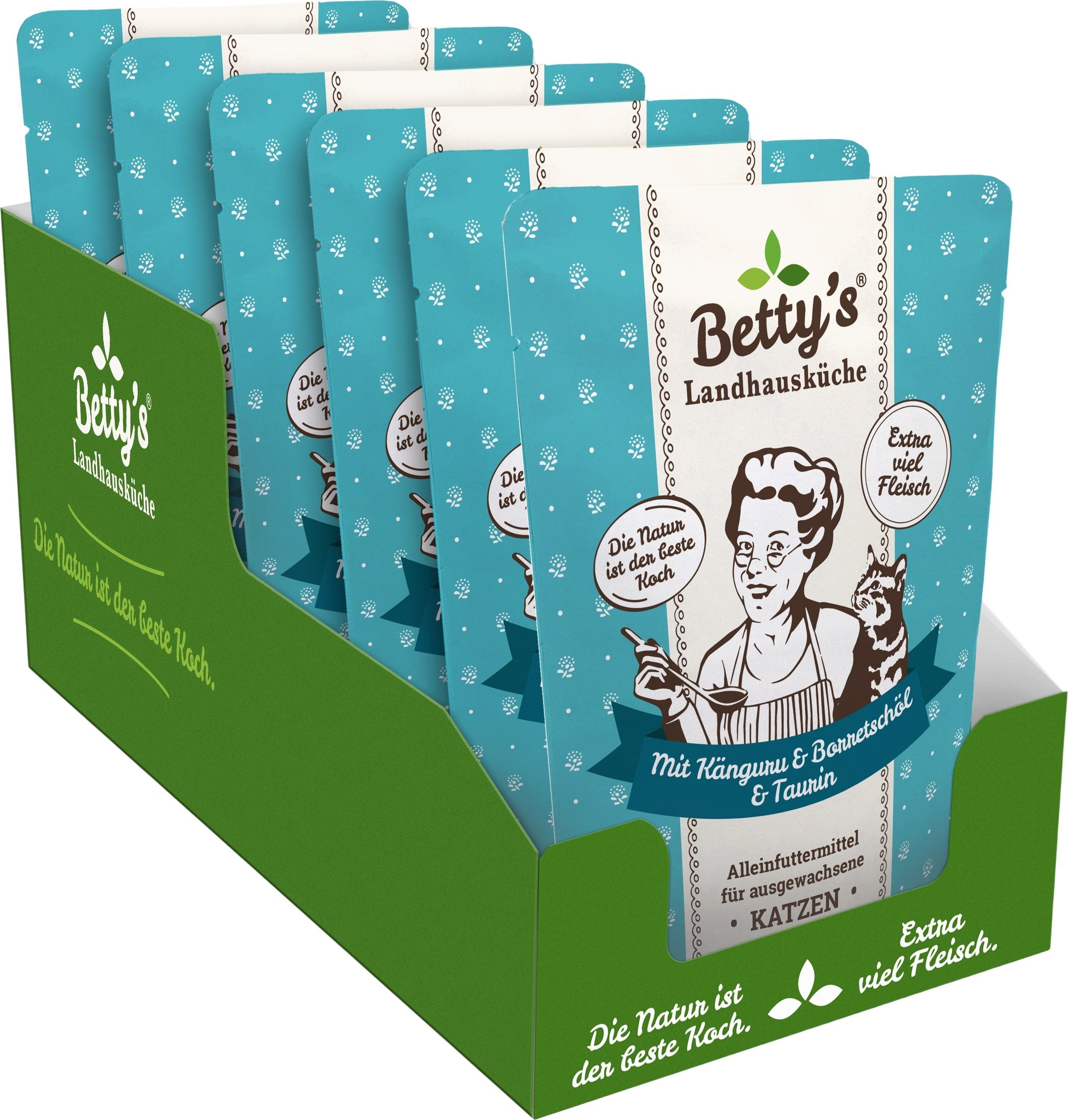 Betty's Landhausküche Mačja hrana v vrečki Adult - kenguru z oljem borage, 6 x 250 g