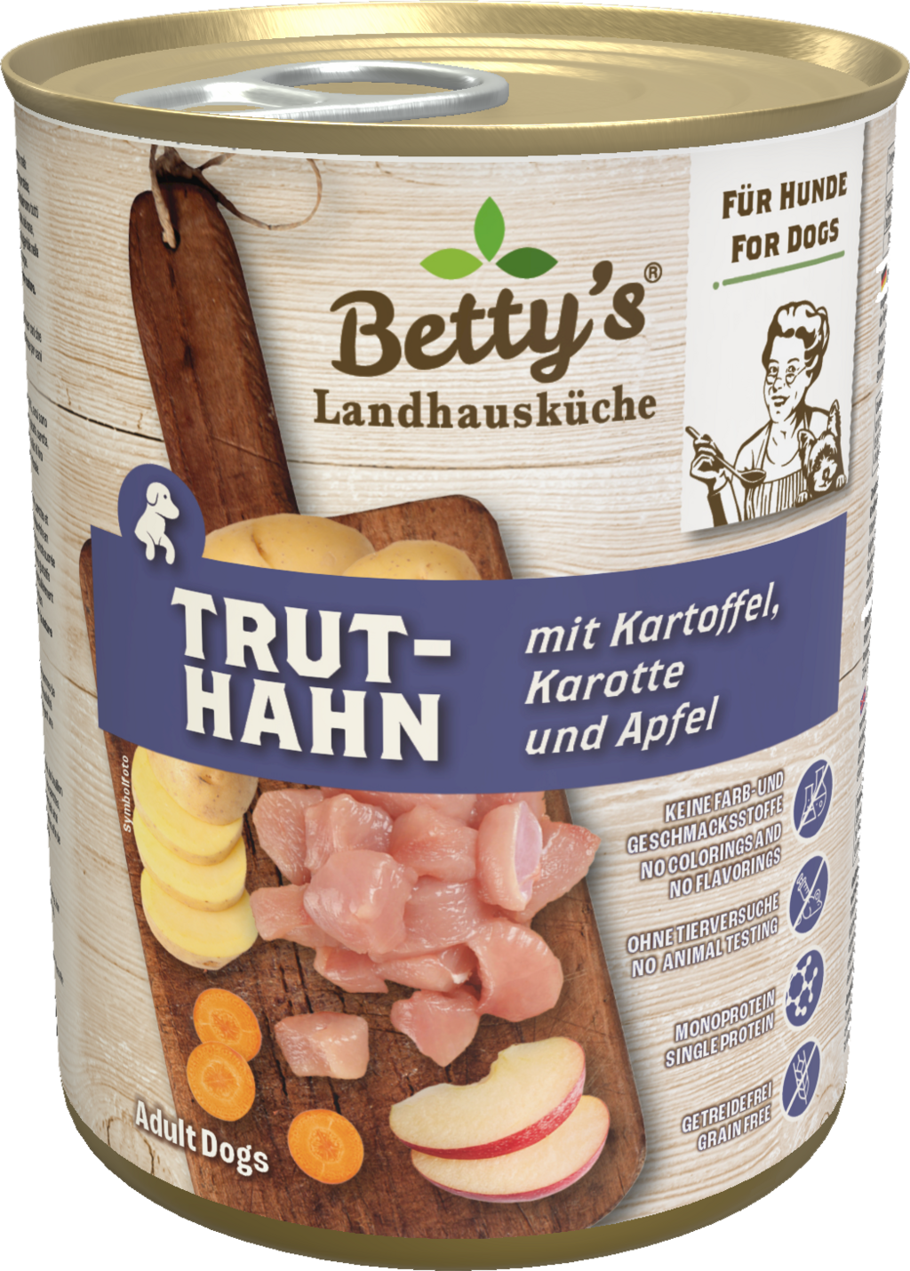 Izkušnenj v jeziku slovenščina za izdelek Betty's Landhausküche Pasja hrana - puran s krompirjem, korenjem & jabolkom