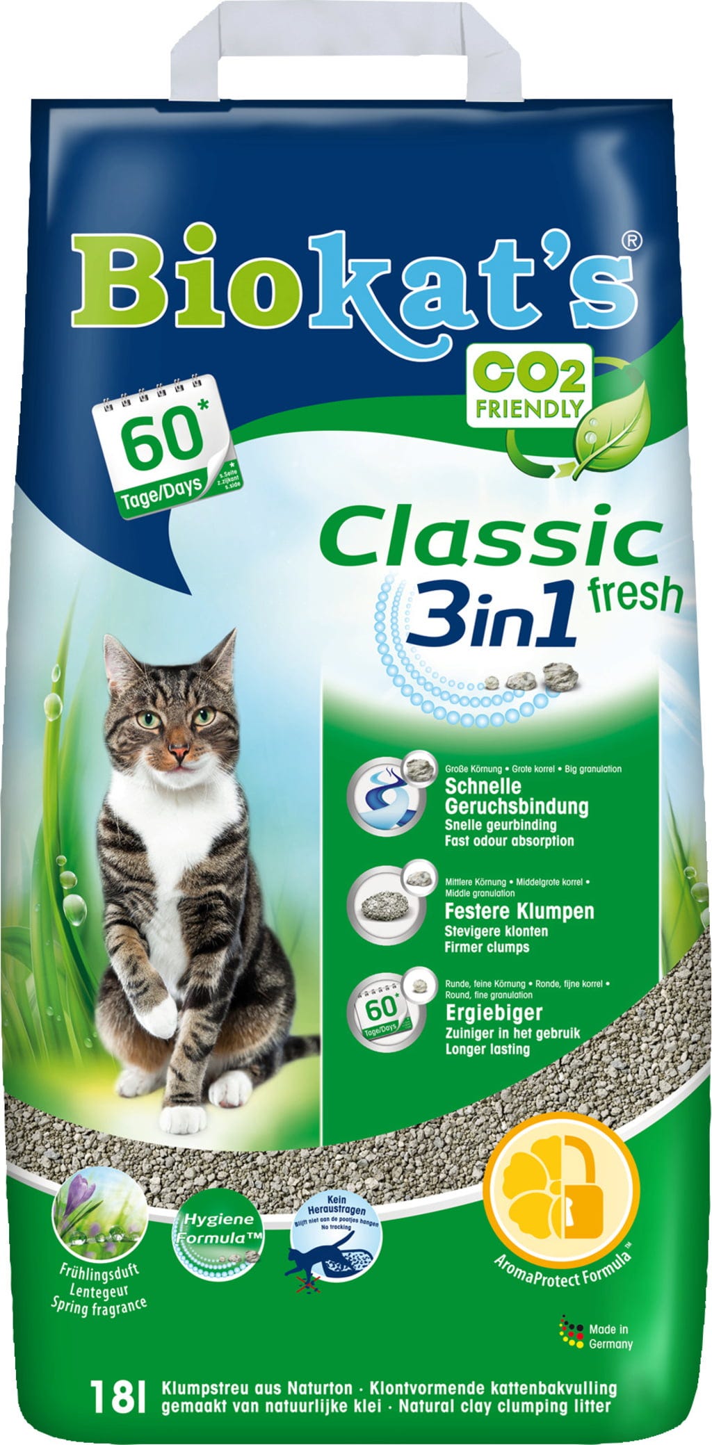 Klasika v ponudbi Biokat's – Classic 3v1 je narejen iz 100% naravne gline v treh različnih velikostih granul, zahvaljujoč Hygiene Formula™. Ta formula tvori izjemno kompaktne grudice, ki jih je mogoče enostavno odstraniti, hkrati pa zagotavlja hiter nadzor nad neprijetnimi vonjavami. Hkrati se posip ne lepi na dlako ali tačke, zato ostane v mačjem stranišču.