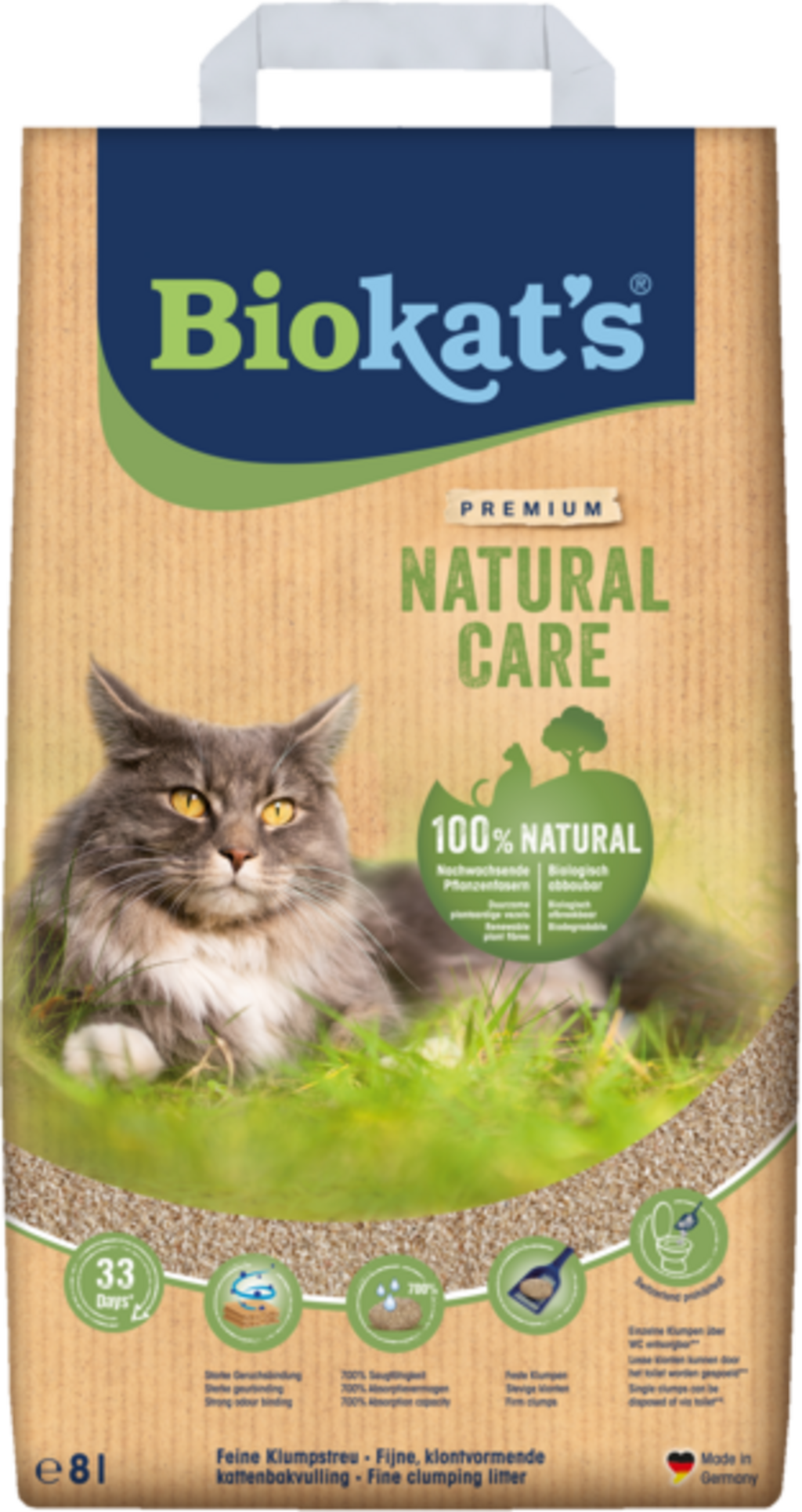 Mačji pesek natural care znamke Biokat's je izdelan iz rastlinskih vlaken in je 100% biološko razgradljiv. Drobnozrnata struktura je izjemno vpojna in tvori stabilne grudice, ki jih je enostavno odstraniti. Seveda se učinkovito vežejo tudi neprijetne vonjave – kar je nujno, če je mačje stranišče v bivalnem prostoru. Posamezne grudice se lahko odvržejo tudi v straniščno školjko. Preostanek peska se lahko celo kompostira.