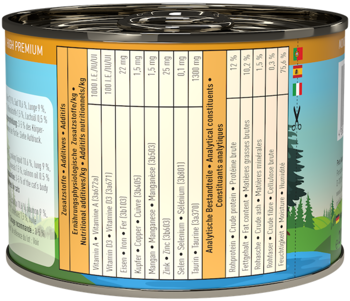 - Več kot 94 % mesa, rib, morskih sadežev, drobovine in tekočine za kuhanje, dopolnjeno z nizkim deležem zelenjave, sadja in drugih sestavin, prijaznih mačkam