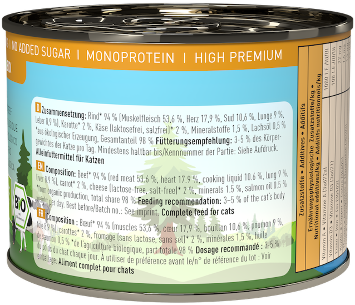 Ta visokokakovostna bio monoproteinska mokra hrana ponuja vaši mački naraven in vrsti primeren priboljšek. Izbrane bio sestavine in posebna receptura, ki temelji na konceptu plena, zagotavljajo vaši mački vse, kar potrebuje, in tako pomembno prispevajo k zdravemu in živahnemu življenju.