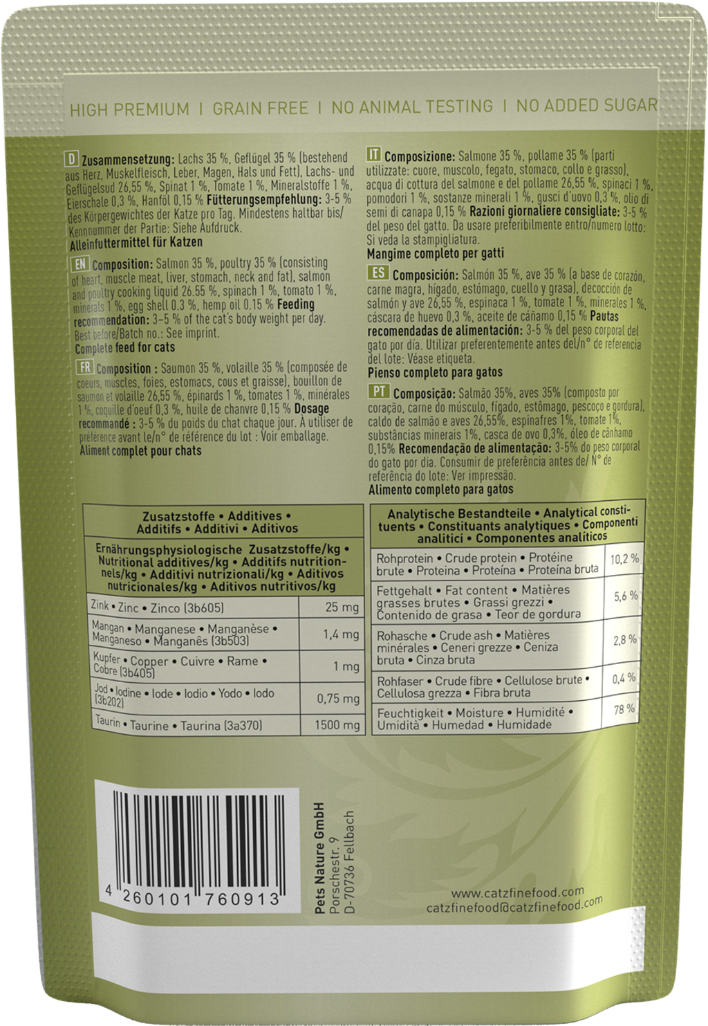 Izkušnenj v jeziku slovenščina za izdelek catz finefood Mačja hrana Classic No. 05 - losos in perutnina, vrečka