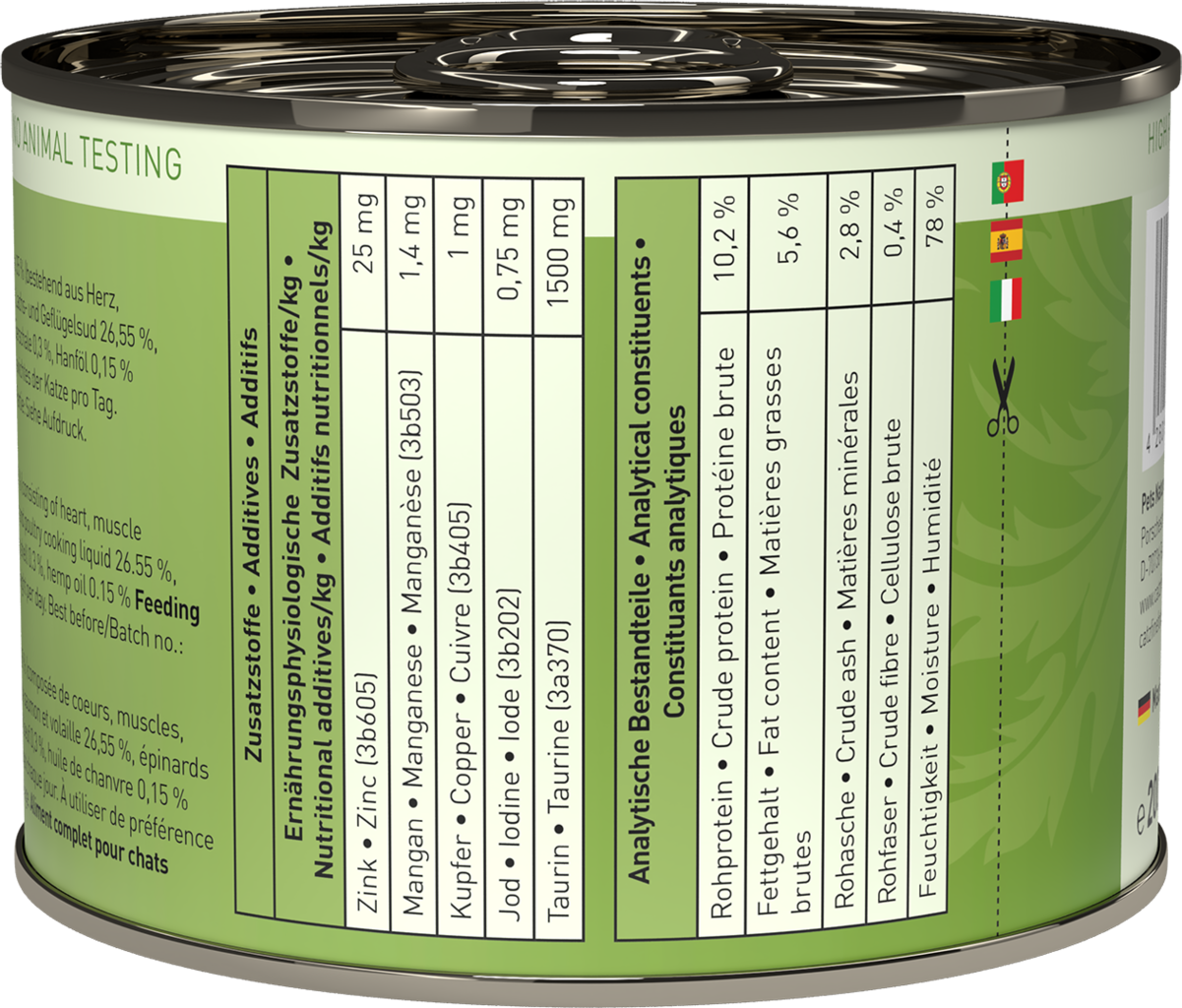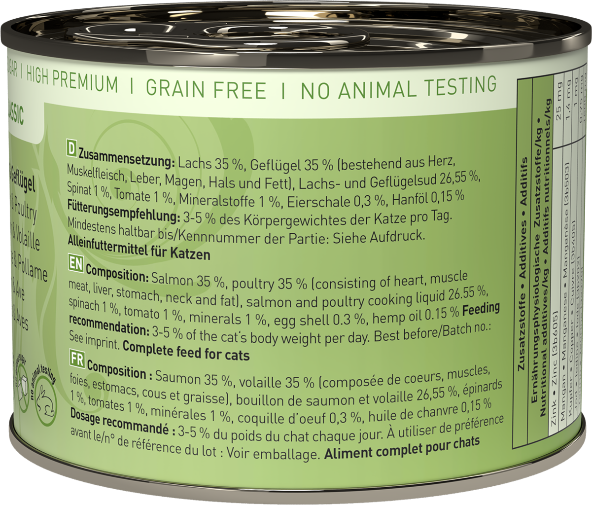 35 % losos, 35 % perutnina (srce, Muskelfleisch, jetra, želodec, vratovina, maščoba), lososova juha, 26,55 % Geflügelsud, 1 % špinača, 1 % paradižnik, 1 % minerali, 0,3 % jajčne lupine, 0,15 % konopljino olje