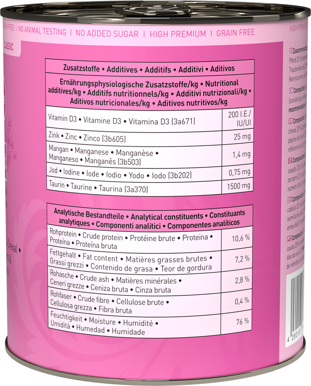 50 % jagnjetina (srce, mišično meso, jetra, pljuča), 23,6 % jagnječja in konjska juha, 20 % konj (mišično meso, srce, jetra), 3 % bučke, 2 % paradižnik, 1 % minerali, 0,2 % ingver, 0,2 % olje grozdnih pešk