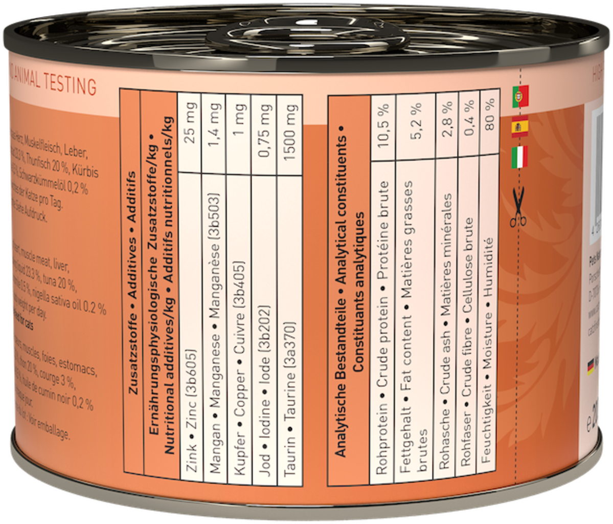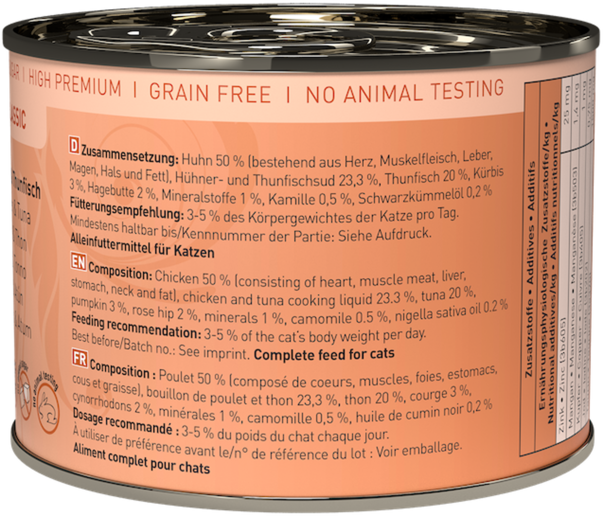 50 % kokoš (srce, Muskelfleisch, jetra, želodec, vratovina, maščoba), Hühnersud, 23,3 % Thunfischsud, 20 % tuna, 3 % buča, 2 % šipek, 1 % minerali, 0,5 % kamilica, 0,2 % olje črne kumine