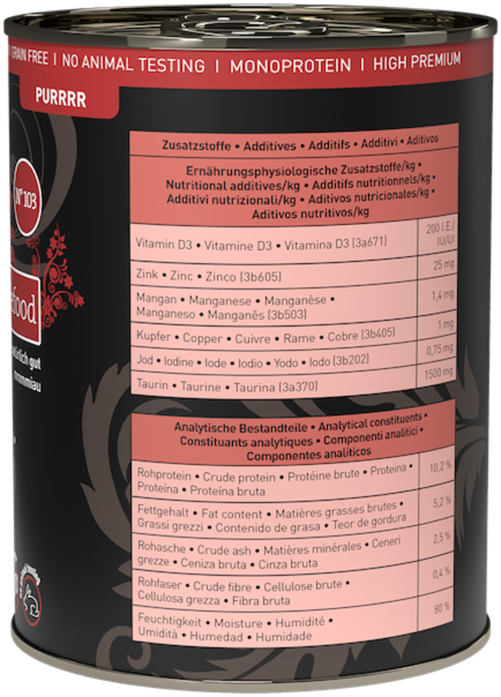 Ta slastna mokra hrana premium kakovosti bo vašo mačko zagotovo navdušila! Izbrane sestavine, vrsti prilagojen recept, ki temelji na konceptu plenilskih živali, in brez nepotrebnih primesi - čisti užitek za vašo mačko in odlična osnova za vitalno mačje življenje.