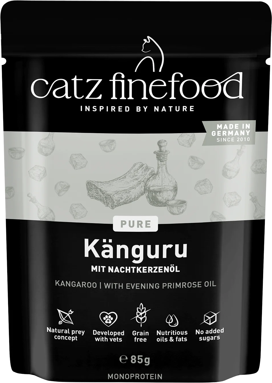 Ta slastna mokra hrana premium kakovosti bo vašo mačko zagotovo navdušila! Izbrane sestavine, vrsti prilagojen recept, ki temelji na konceptu plenilskih živali, in brez nepotrebnih primesi - čisti užitek za vašo mačko in odlična osnova za vitalno mačje življenje.