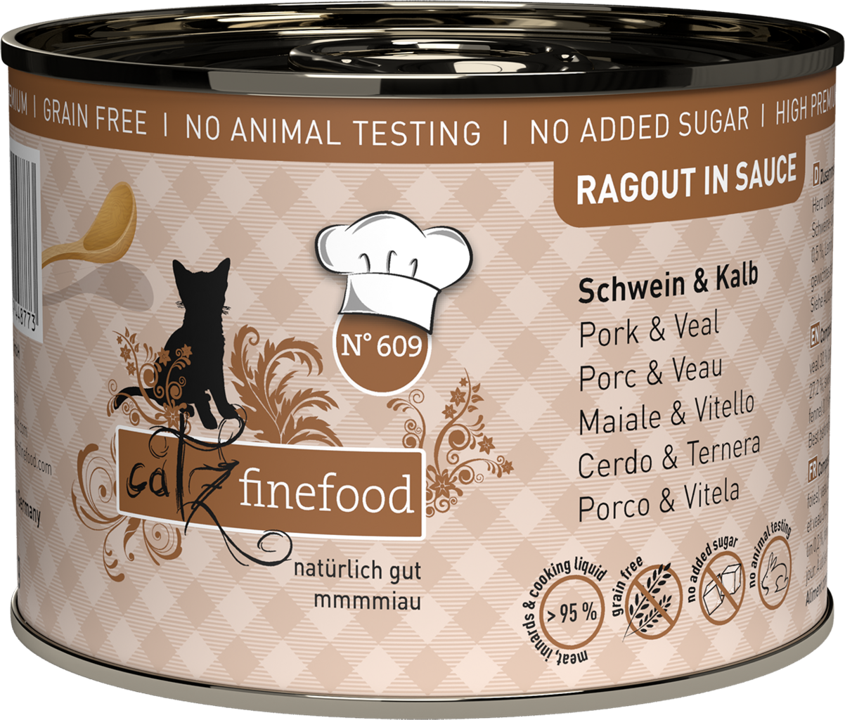 Izkušnenj v jeziku slovenščina za izdelek catz finefood Mačja hrana Ragout No. 609 - svinjina in teletina