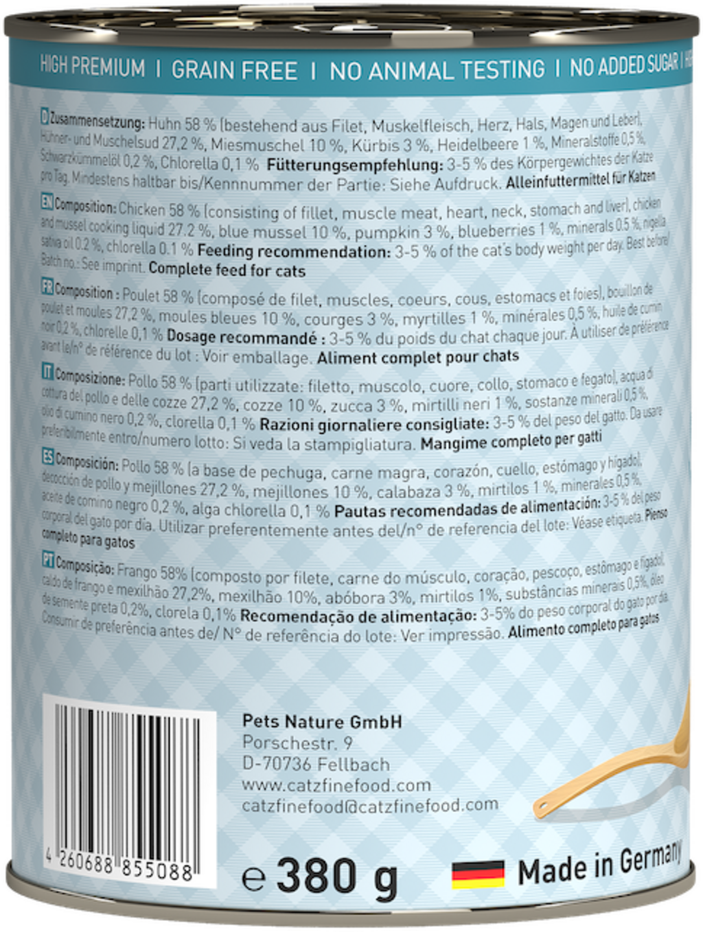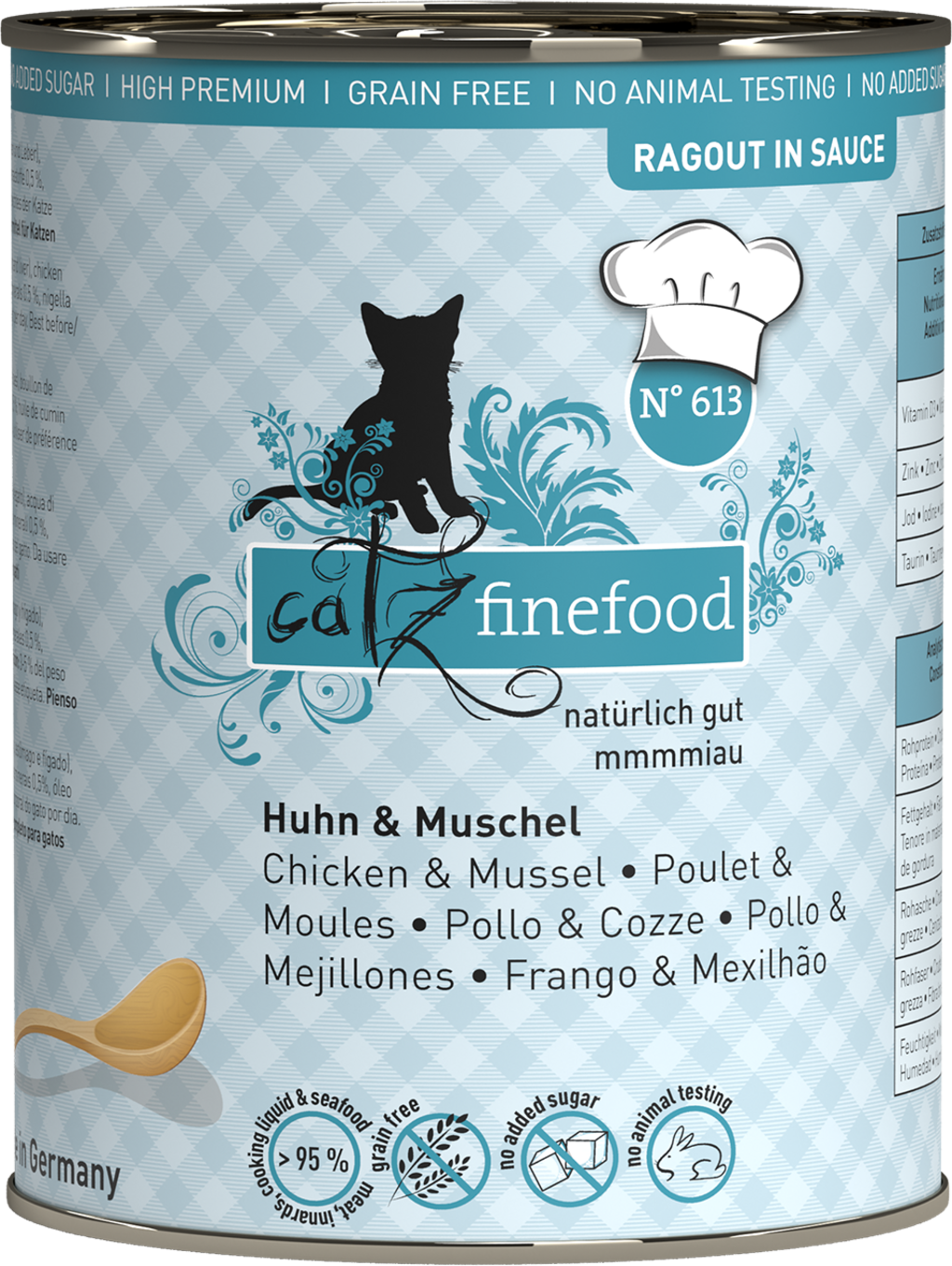 Izkušnenj v jeziku slovenščina za izdelek catz finefood Mačja hrana Ragout No. 613 - piščanec in školjke