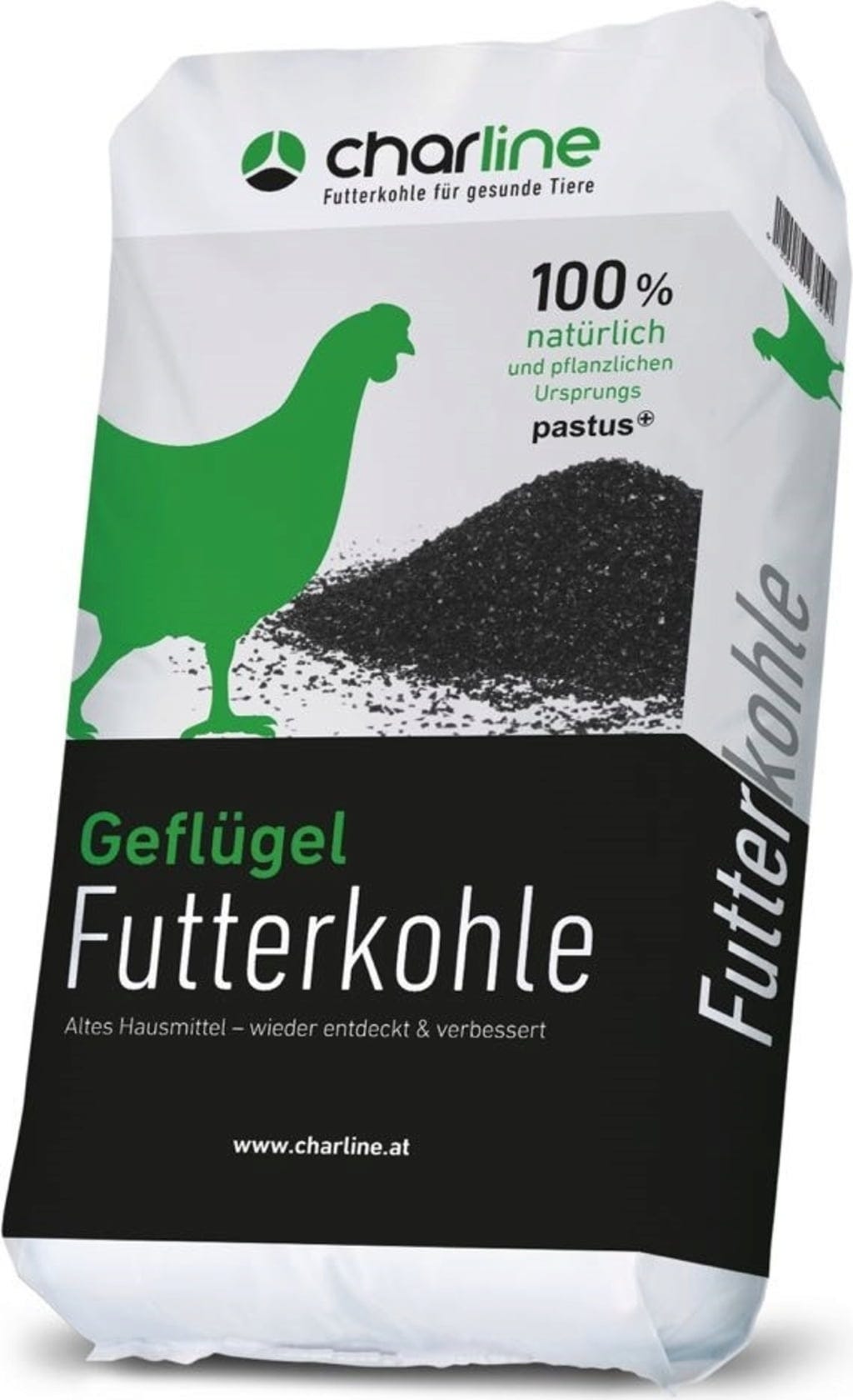 Krmno oglje je narejeno iz mešanice različnih rastlinskih ogljev in je na voljo v drobnozrnati obliki.