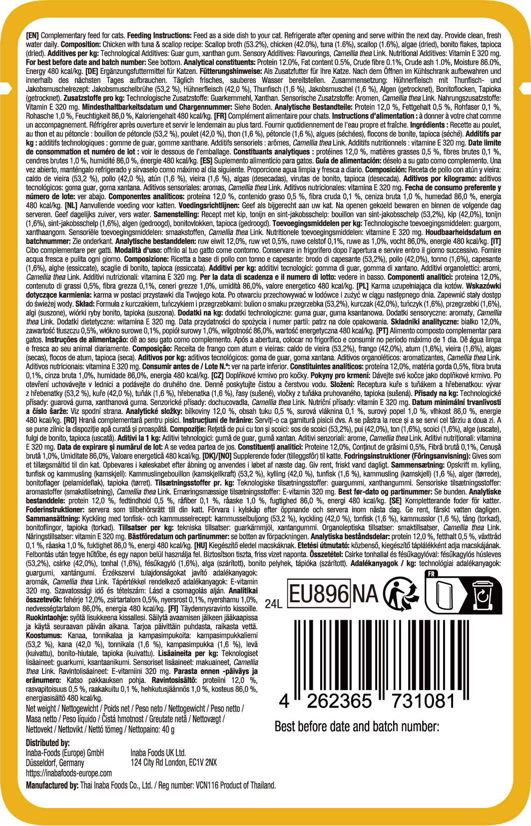 53,4 % Jakobsmuschel-Brühe, 41,8 % piščančje meso, 1,6 % tuna, 1,6 % Jakobsmuscheln, Bonitoflocken, posušena tapioka, Agar, Guarkernmehl, ksantan