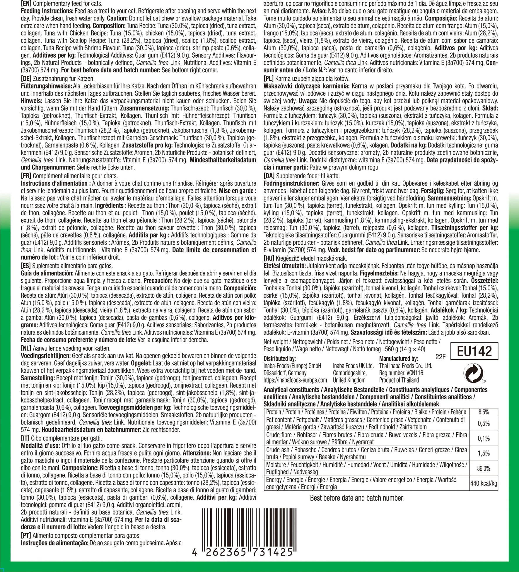 15 % tuna, 15 % piščančje meso, tapioka, Thunfisch-Extrakt, kolagen, ekstrakt zelenega čaja