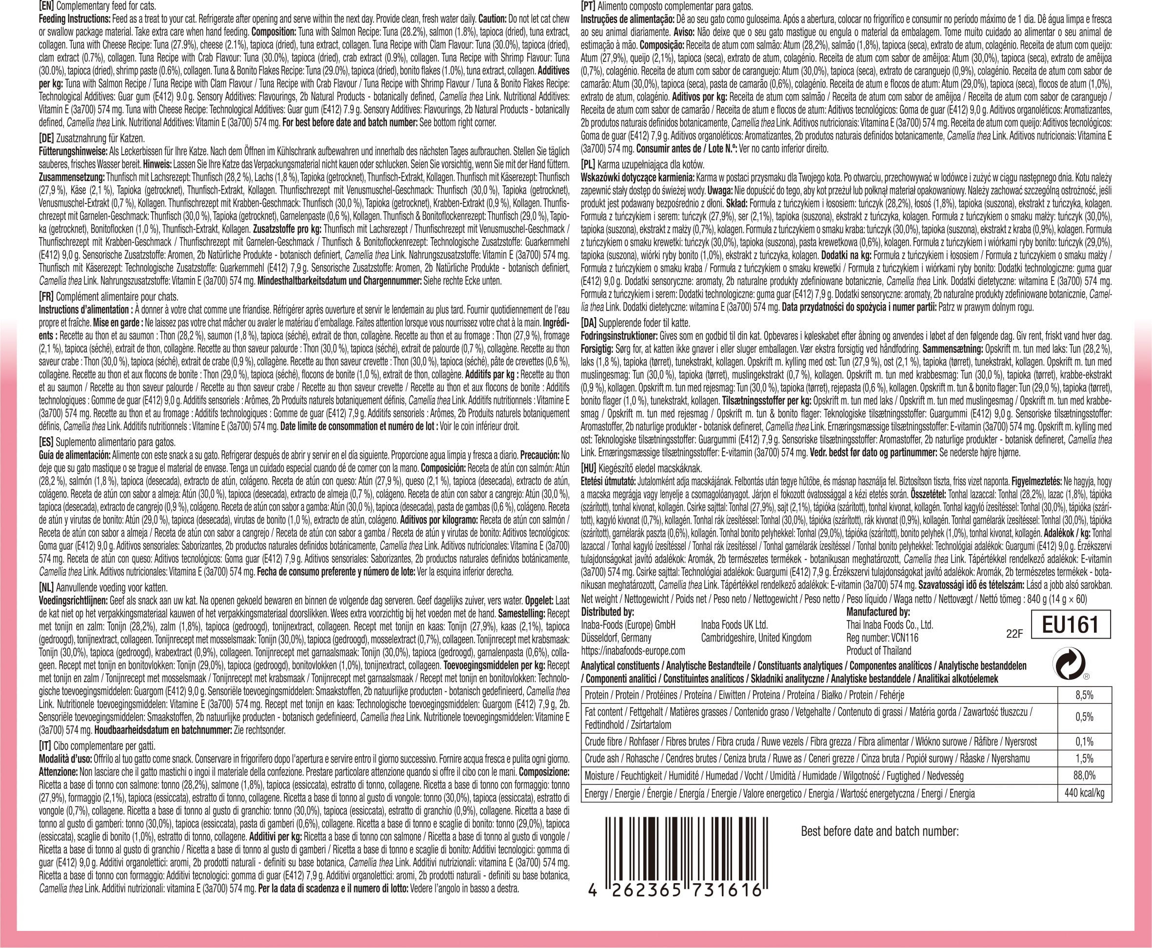 28,2 % tuna, 1,8 % losos, tapioka, Thunfisch-Extrakt, kolagen, ekstrakt zelenega čaja