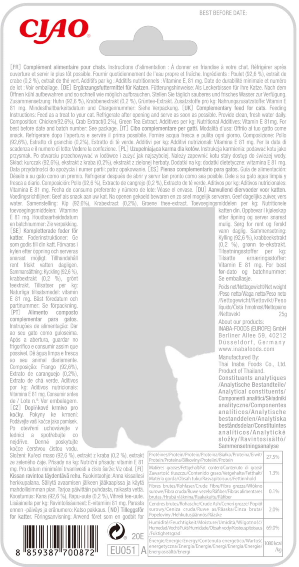 92,6 % piščanec, 0,2 % izvlečki rakov, ekstrakt zelenega čaja
