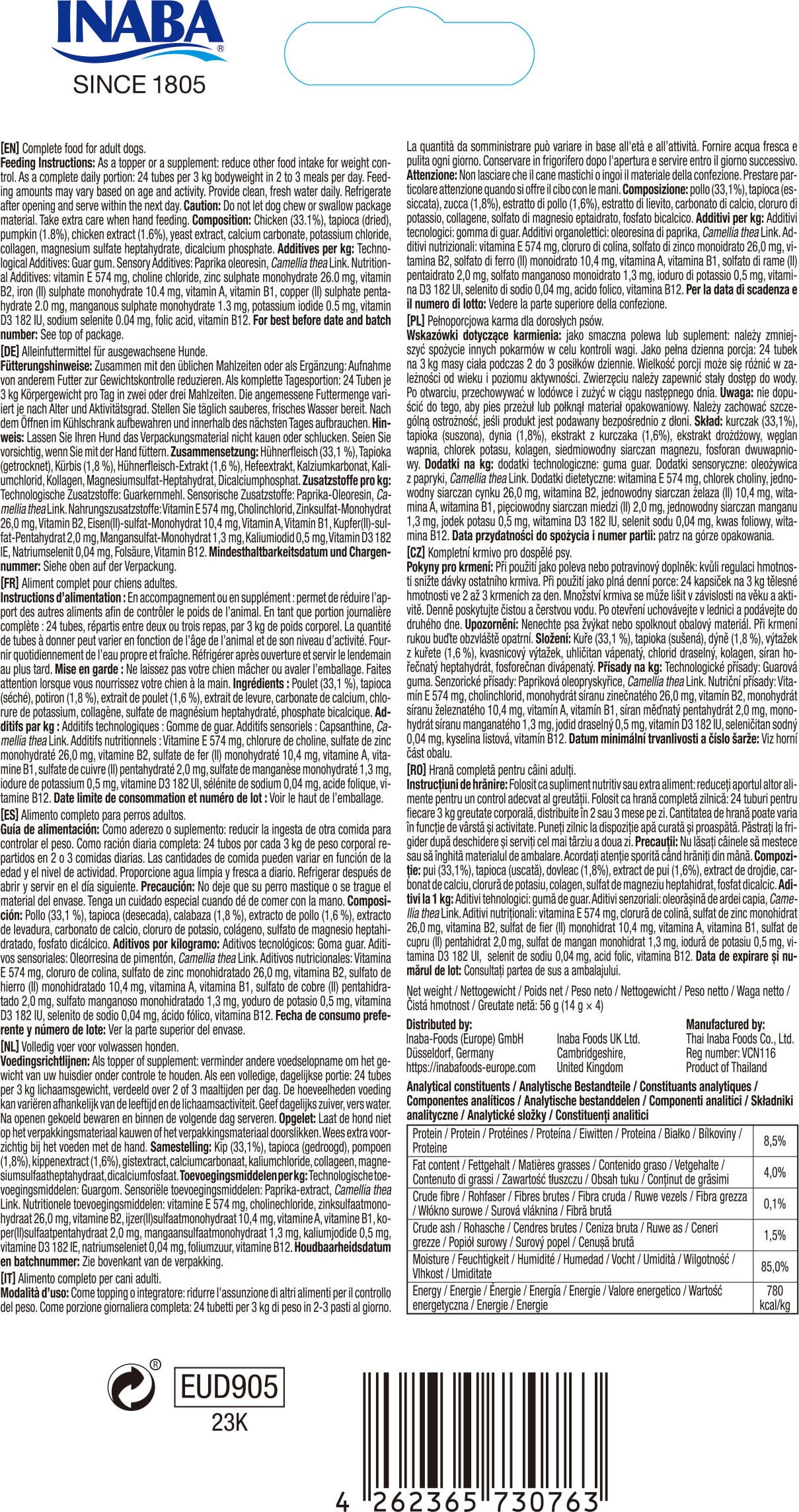 33,1 % piščančje meso, posušena tapioka, 1,8 % buča, 1,6 % piščančje meso, ekstrakt kvasa, kalcijev karbonat, kalijev klorid, kolagen, magnezijev sulfat heptahidrat, dikalcijev fosfat