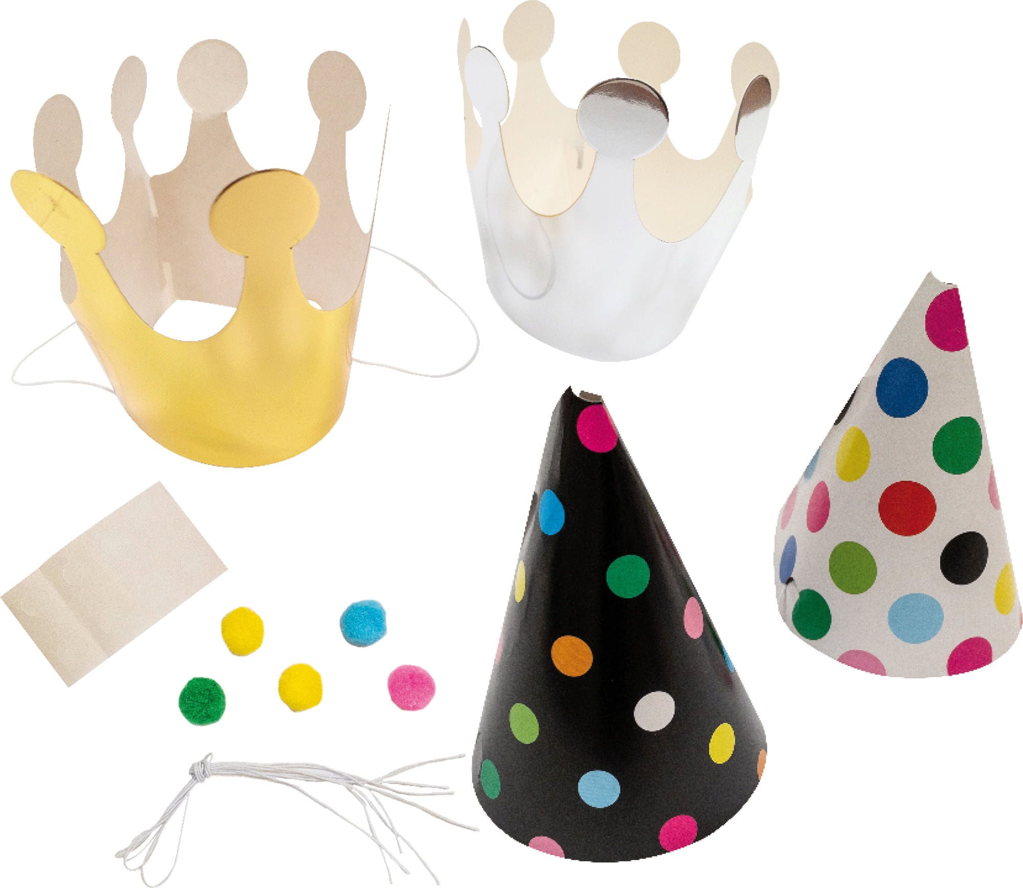 Ni zabave brez klobučka! Tako lepo pokriti" bodo slavljenec in njegovih 5 gostov blesteli na vsaki fotografiji. Komplet vsebuje dve sijoči kroni, 4 pisane klobuke, ujemajoče se cofe in elastike. Karton je prevlečen, zato ti klobuki prenesejo marsikaj.