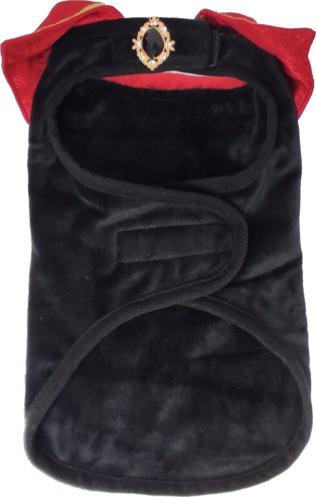 Mehak črn plašč je opremljen z elegantnim rdečim ovratnikom z zlatimi detajli in takoj spomni na hladne prijatelje noči. Zaradi praktičnega sprijemalnega traku na vratu se kostum hitro in enostavno obleče ter sleče, tako da lahko vaš pes udobno prevzame vlogo zloglasnega vampirja.