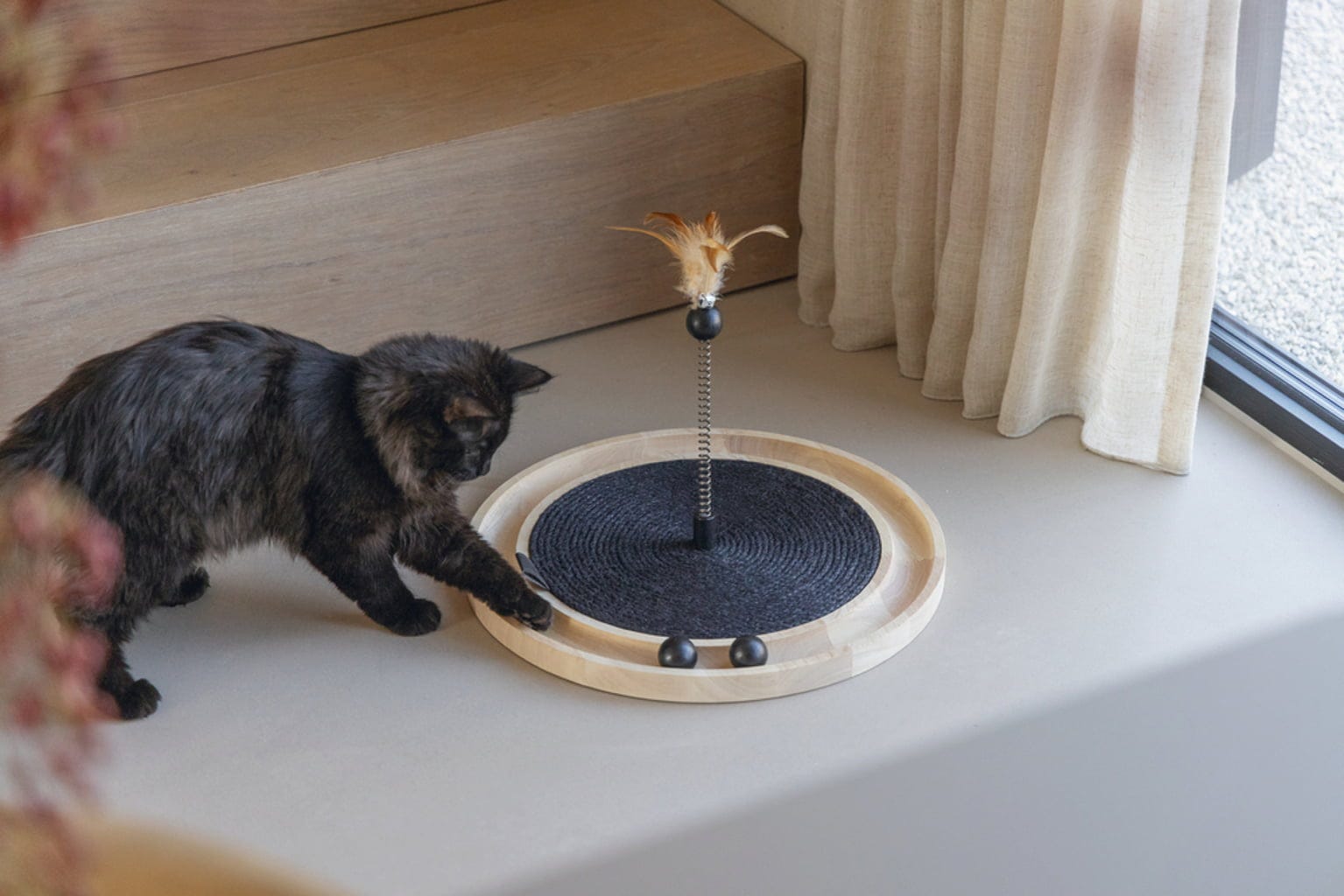 Toliko zabave pri igri lahko prinese moderen dizajn! S to stilsko igračo vaši mački zagotovo ne bo dolgčas: podloga iz sisala na sredini je odlična priložnost za praskanje, pod katero lahko skrijete mačjo meto. Pero z leseno kroglico in kroglice, ki se zabavno premikajo po stezi, na igriv način spodbujajo lovski nagon vaše mačke ter zagotavljajo vrsti primerno zaposlitev, ki spodbuja telo in duha.