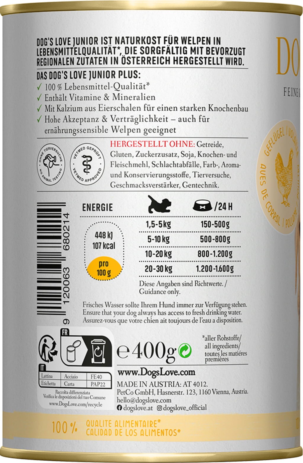 Izdelano v Avstriji; brez žit, glutena, dodanega sladkorja, soje, kostne in mesne moke, klavniških odpadkov, barvil, arom in konzervansov, testiranja na živalih, ojačevalcev okusa ali GSO.