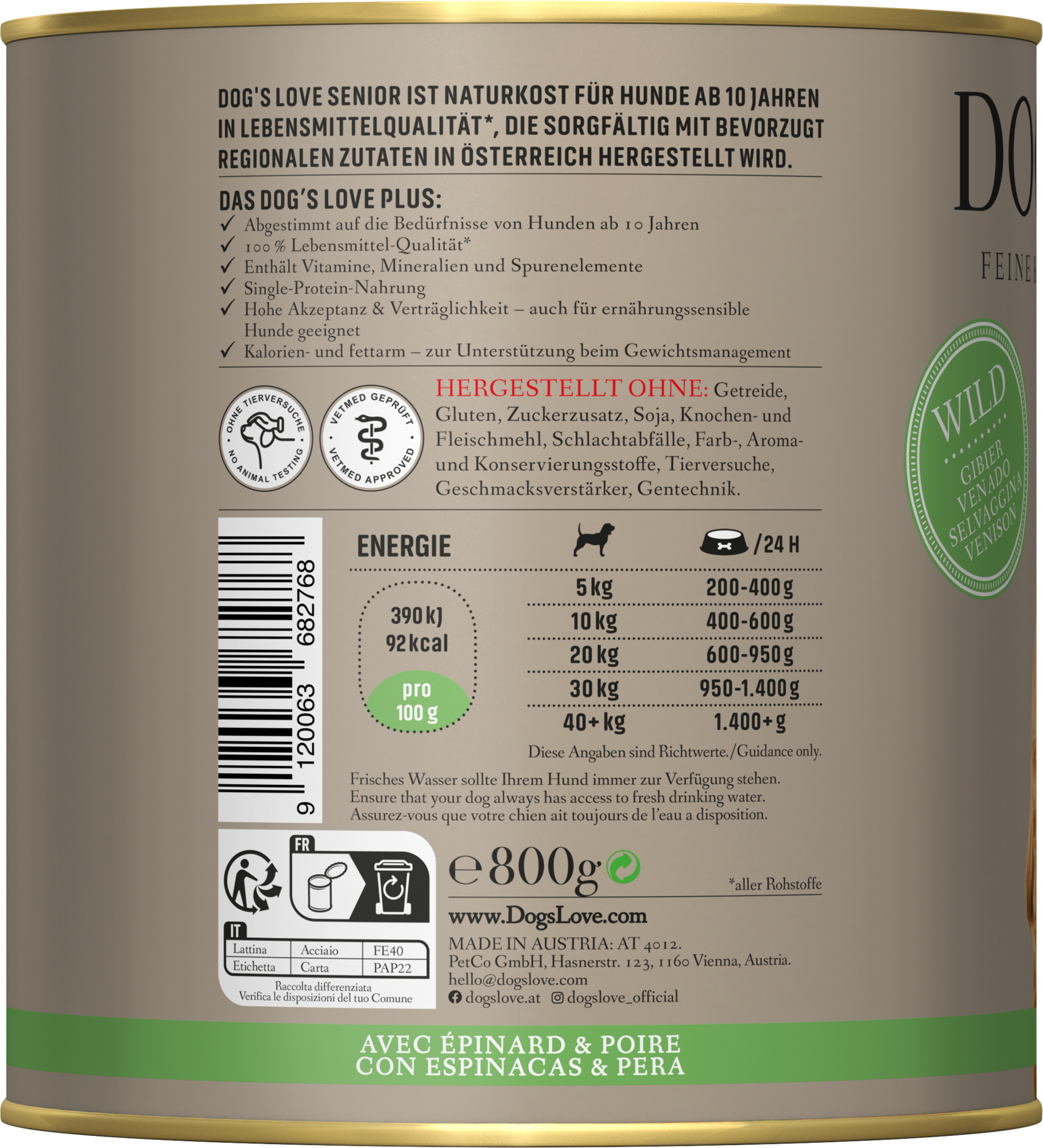 Izkušnenj v jeziku slovenščina za izdelek DOG'S LOVE Pasja hrana Senior - divjačina