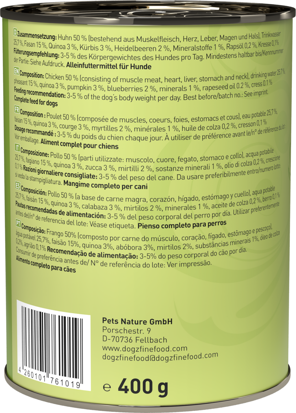 50 % kokoš (Muskelfleisch, srce, jetra, želodec, vratovina), 25,7 % pitna voda, 15 % fazan, 3 % kvinoja, 3 % buča, 2 % borovnice, 1 % minerali, 0,2 % repično olje, 0,1 % kreša