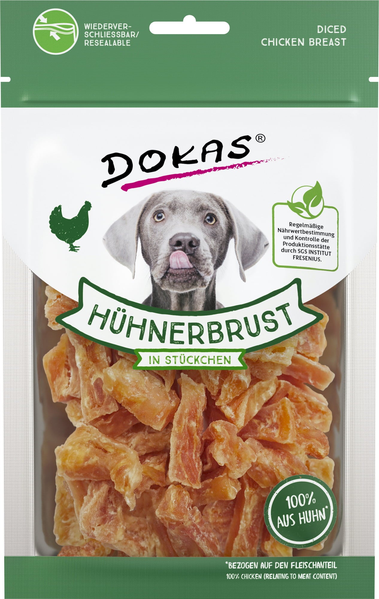 Dokasovi koščki piščančjih prsi so narejeni iz 100-odstotnega fileja piščančjih prsi* in so poslastica z nizko vsebnostjo maščob. Majhni koščki so idealna spodbuda za motivacijo med treningom in so vedno dobra izbira za na pot.