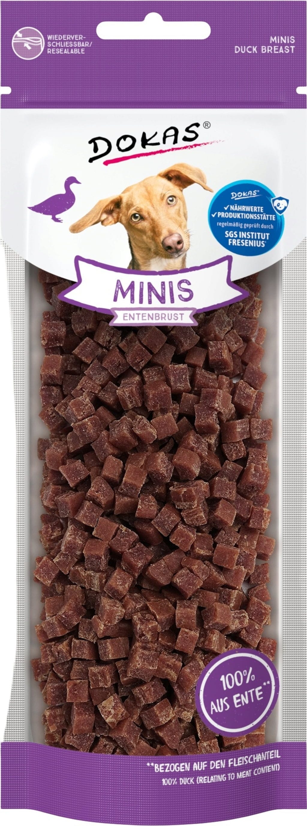 S svojo kompaktno velikostjo so Dokas Minis iz 100-odstotnega mesa račjih prsi* idealna spodbuda za motivacijo za treninge. Minije pa lahko zaradi priročne embalaže tudi hitro pospravite in vzamete s seboj, ko ste na poti. Z dragocenim L-karnitinom.