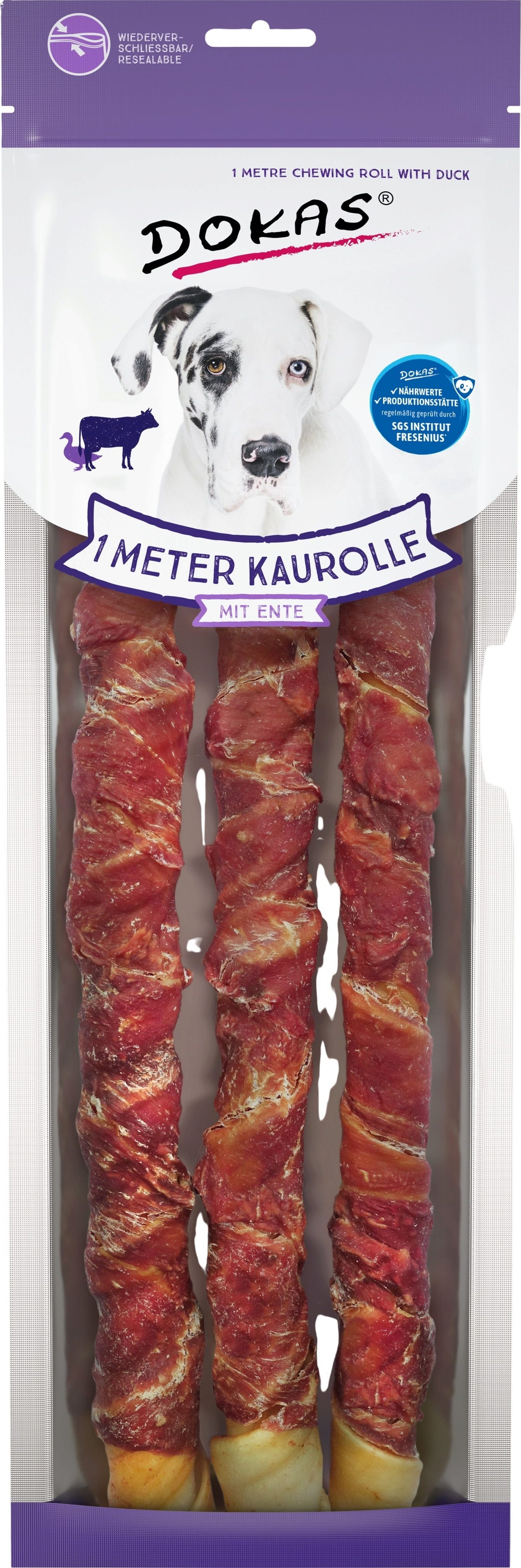 1-metrski žvečilni zvitek znamke Dokas ponuja posebno dolgo zabavo pri grizljanju. Nasitna goveja koža, prekrita s finim filejem račjih prsi, navduši tudi z okusom in je idealna nagrada za vašega štirinožca.