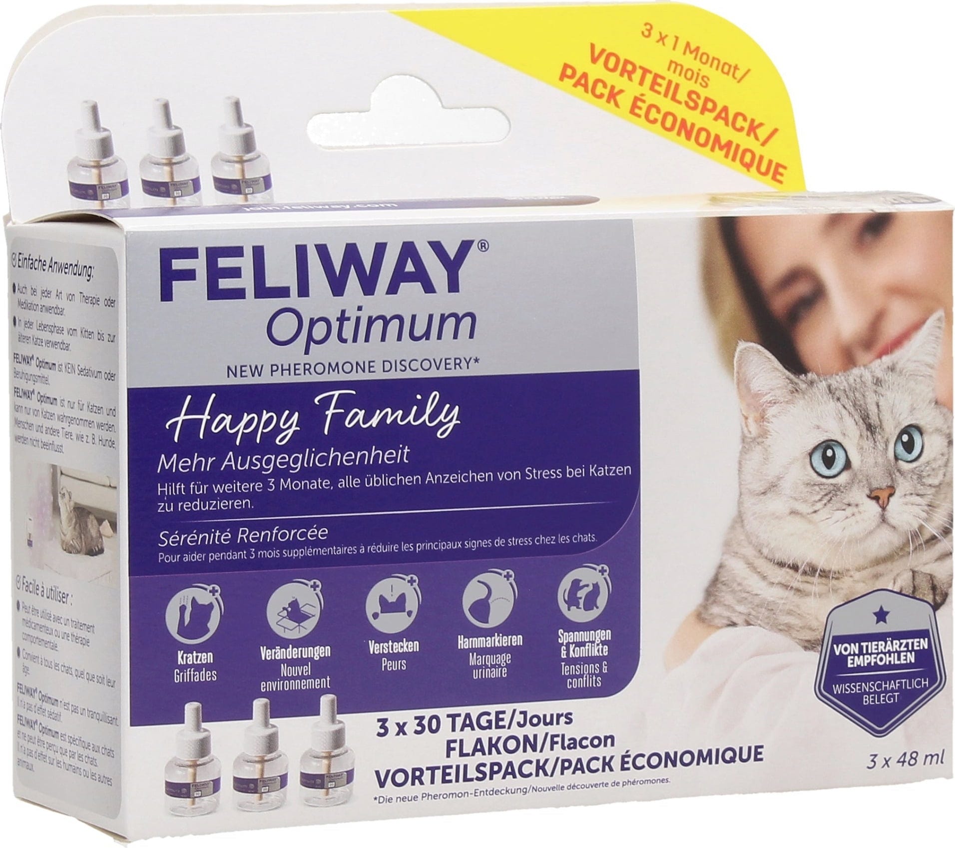 ► Ta varčni paket vsebuje 3 stekleničke Feliway Optimum po 48 ml. Ena steklenička zadostuje za 30 dni.