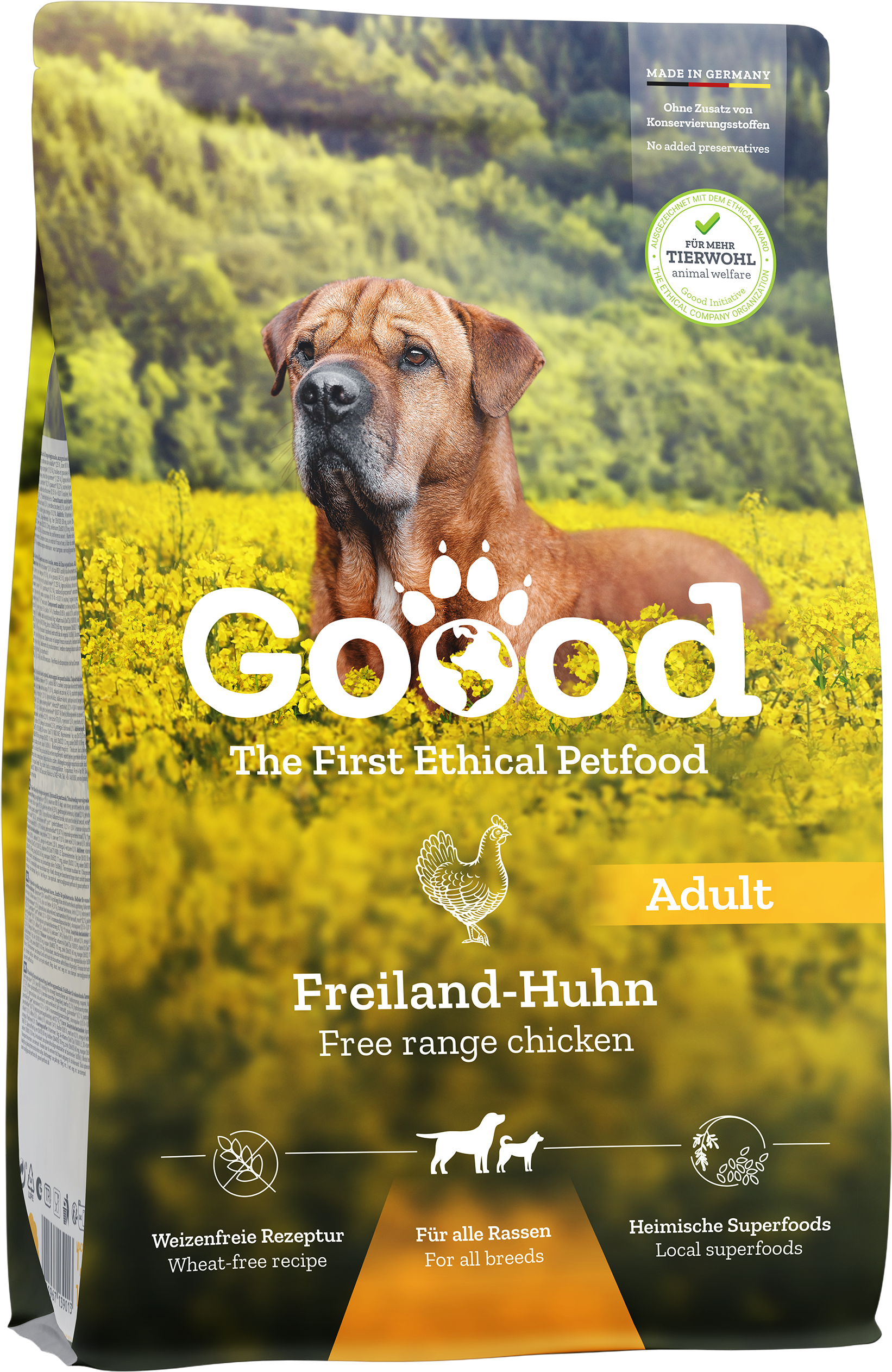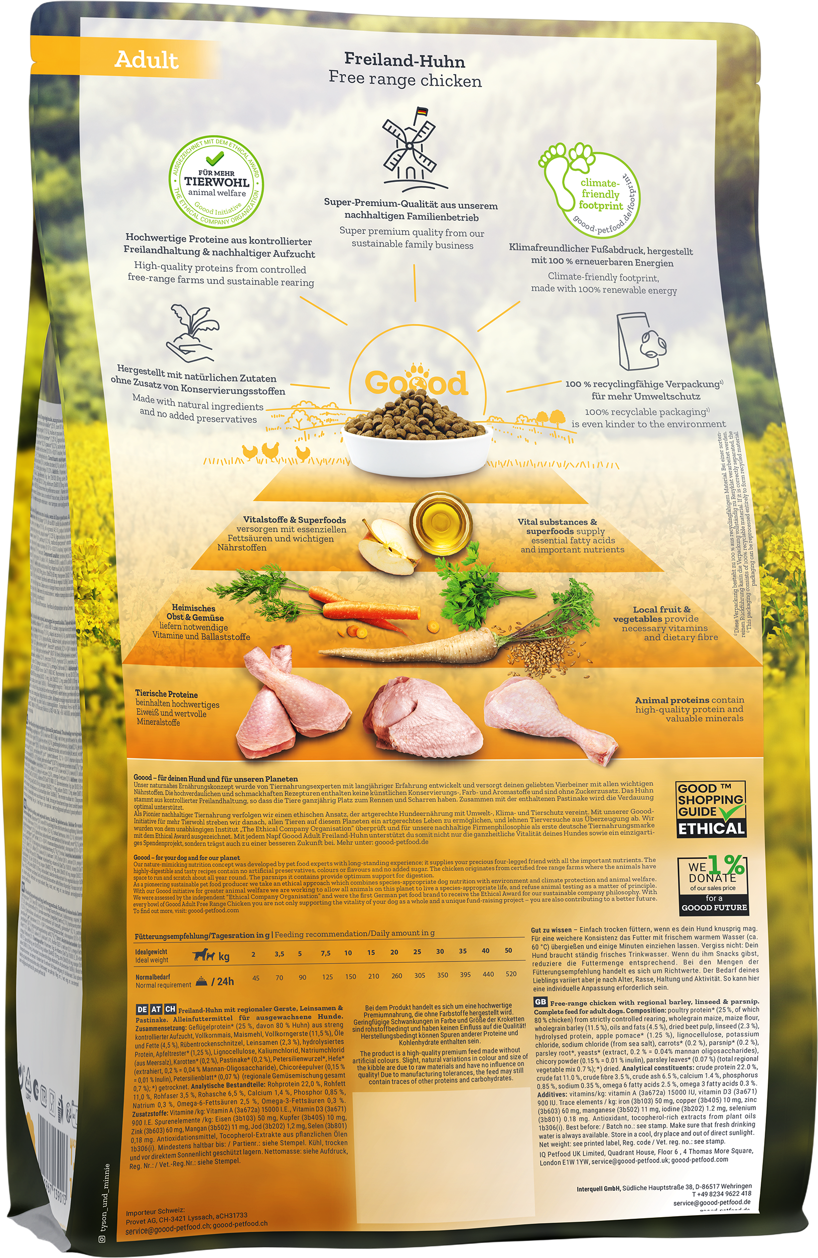 Iščete za svojega psa prehrano, ki ni le uravnotežena in vrsti primerna, temveč tudi dela naš svet malce boljši? Potem je Goood Adult s piščancem iz proste reje prava izbira! Vrsti primerna prehrana je namreč temelj za vitalno življenje psa – in to s polnim spoštovanjem do narave.