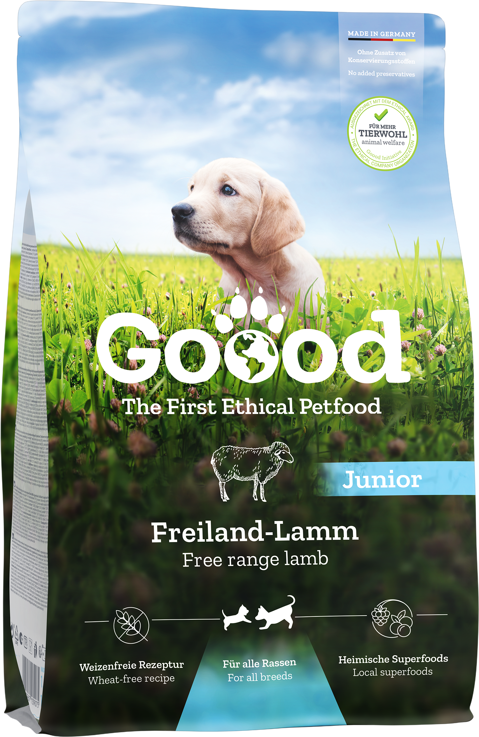 Za svojega mladega razigranega psa iščete prehrano, ki ni le uravnotežena in vrsti primerna, temveč tudi dela naš svet malce boljši? Potem je Goood Junior s pašno jagnjetino prava izbira! Vrsti primerna prehrana se namreč začne že pri najmlajših – in to s polnim spoštovanjem do narave.