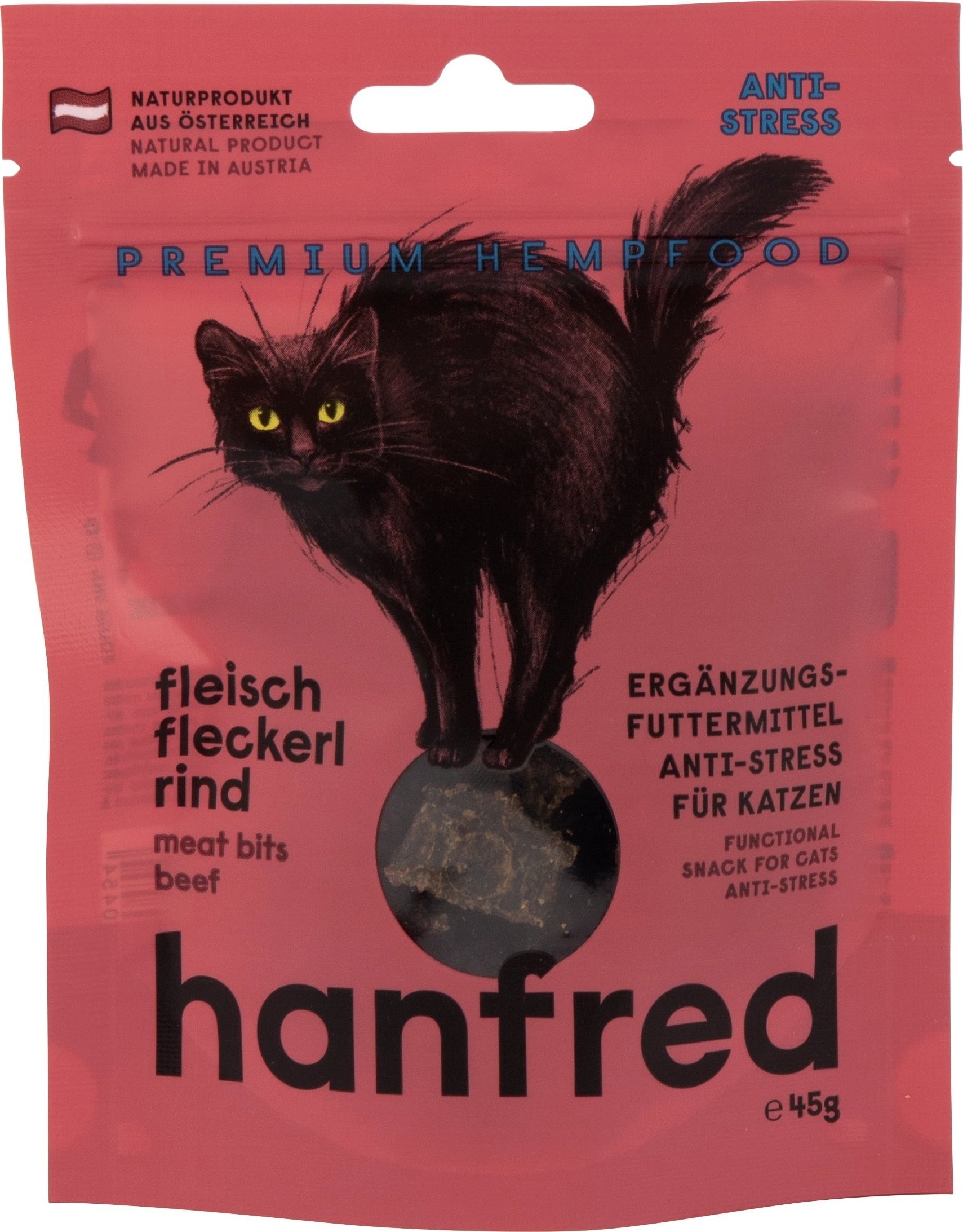 Če je vaša mačka občutljiva na spremembe ali stresne situacije, je ta prigrizek lahko dobra izbira. Hanfred mesne pogače so narejene iz 95 % mesa in 5 % konopljinega prahu - popolnoma brez žit in umetnih dodatkov.