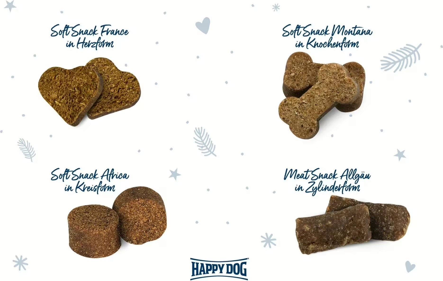 - Priboljški v 4 različnih različicah - mehak prigrizek Francija, mehak prigrizek Montana, mehak prigrizek Afrika in mesni prigrizek Allgäu