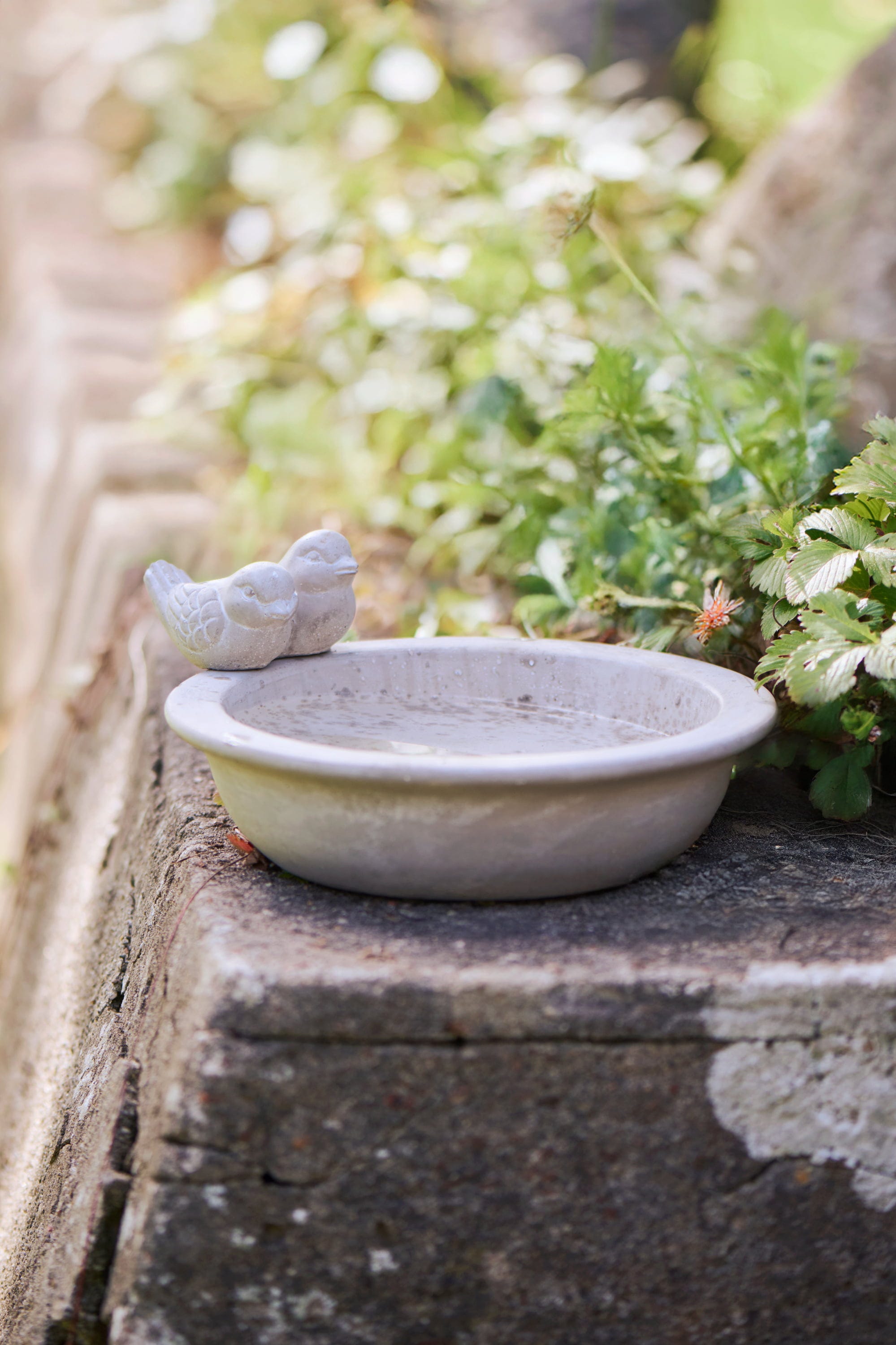 Prvi dve ptici sta se že naselili v tej ptičji kopeli, kmalu pa bodo sledile še druge. S to okrasno ptičjo kadjo pernatim obiskovalcem vašega vrta ponujate varno mesto za osvežitev.