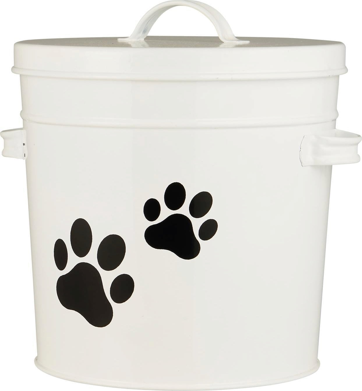 Trpežno kovinsko veds prikupnim motivom šap je idealna rešitev za shranjevanje suhe pasje ali mačje hrane, priboljškov ali igrač.