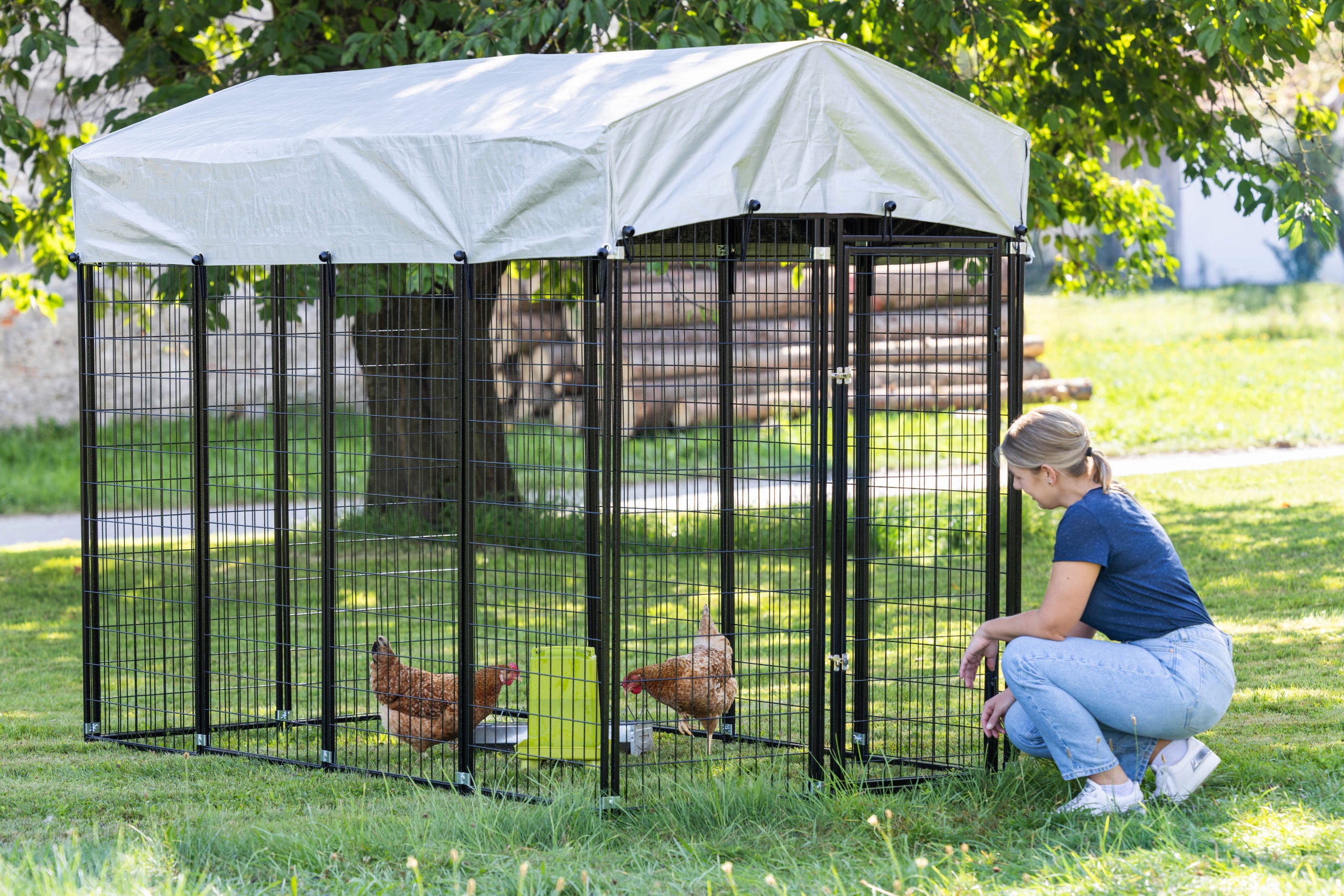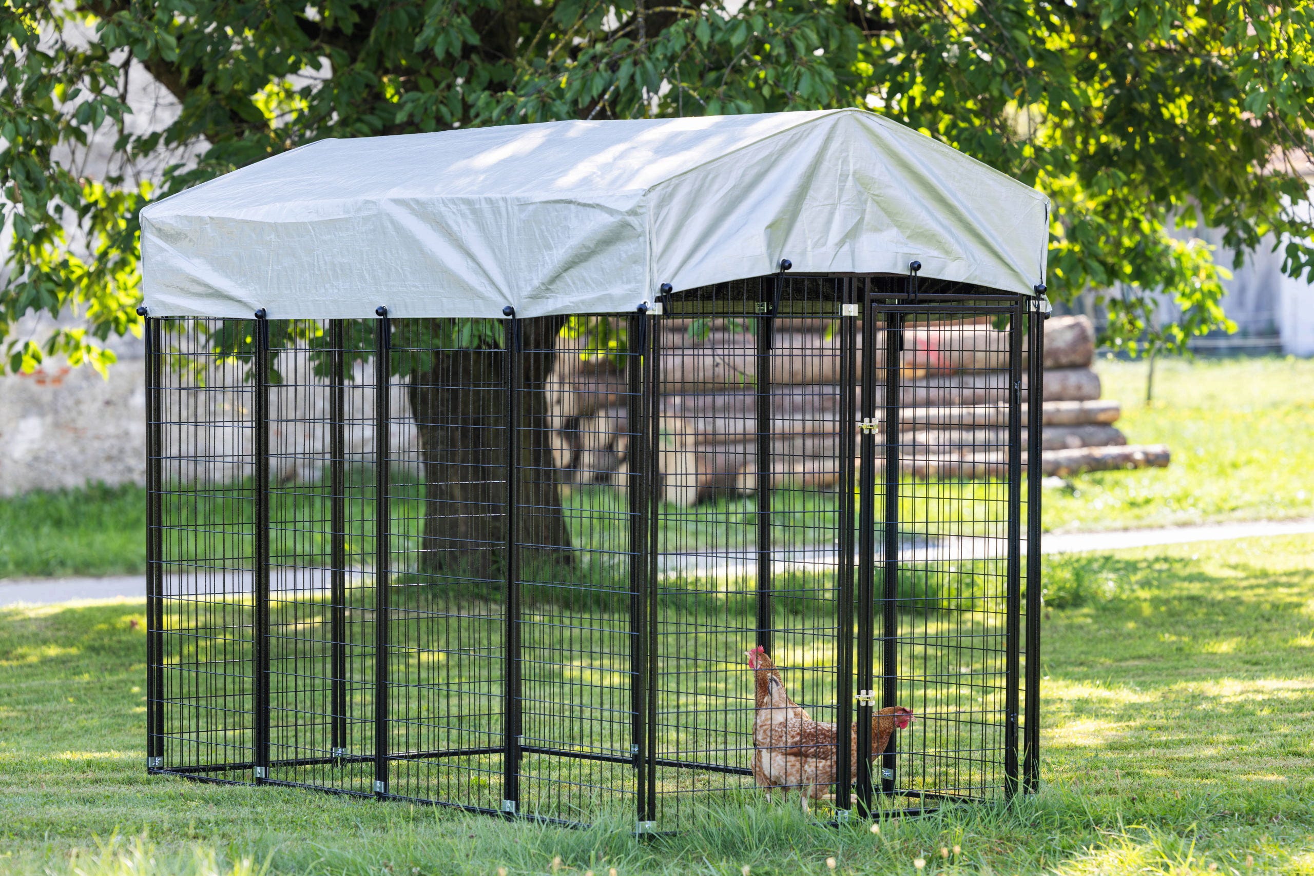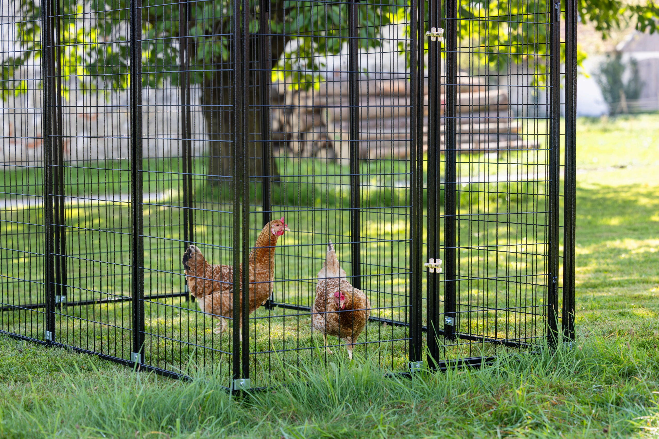 - Prilagojeno življenjsko okolje: Ograda ponuja dovolj prostora za naravna vedenja, kot so praskanje in brkljanje – odlično za kokoši, gosi ali druge male živali.