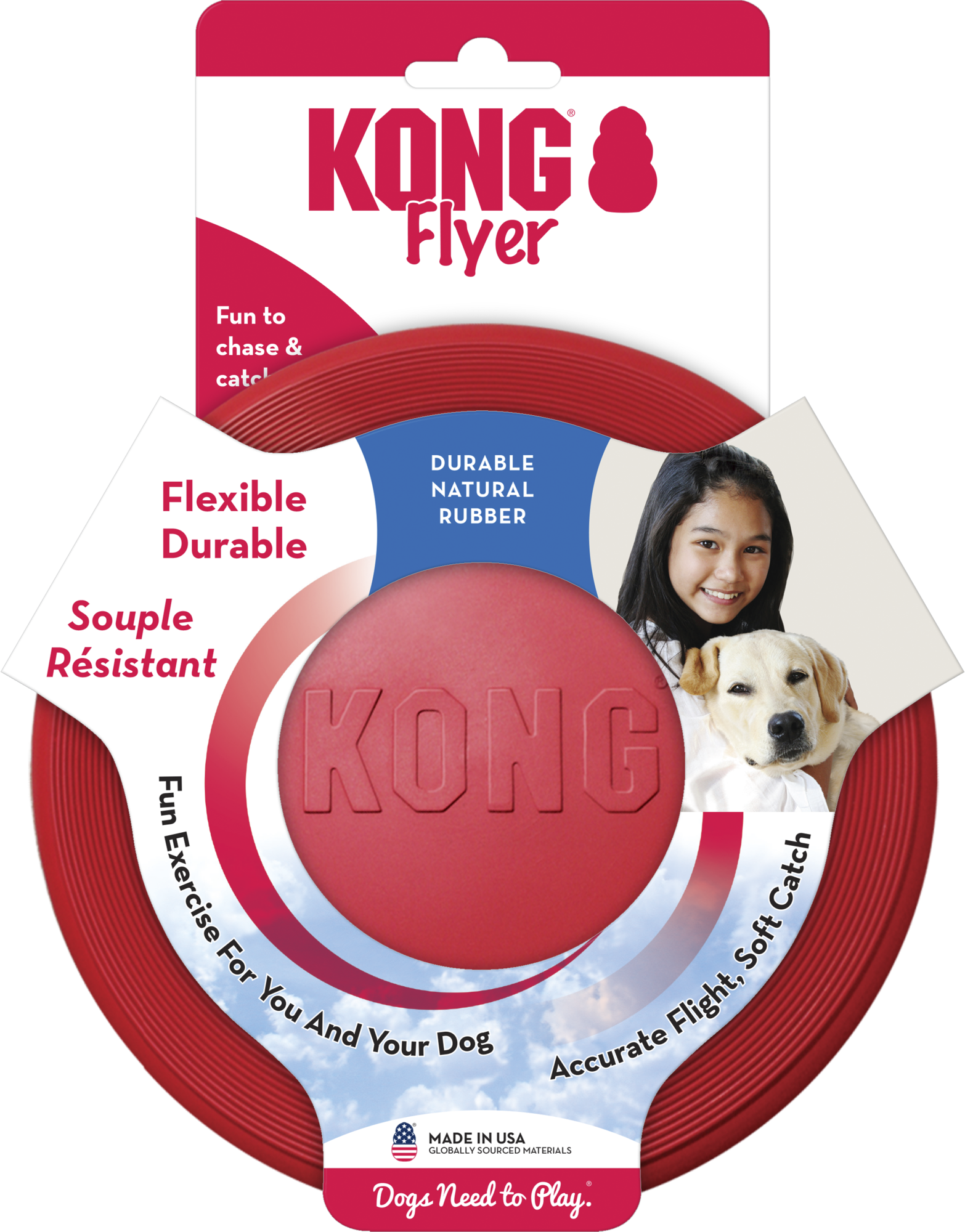 Igrača KONG® Flyer je odlična za pse, ki radi prinašajo in lovijo različne predmete. Zaradi živahne barve je ta frizbi igrača zelo vidna, trpežen in prožen material iz naravnega kavčuka pa zagotavlja ure in ure zabave pri žvečenju!