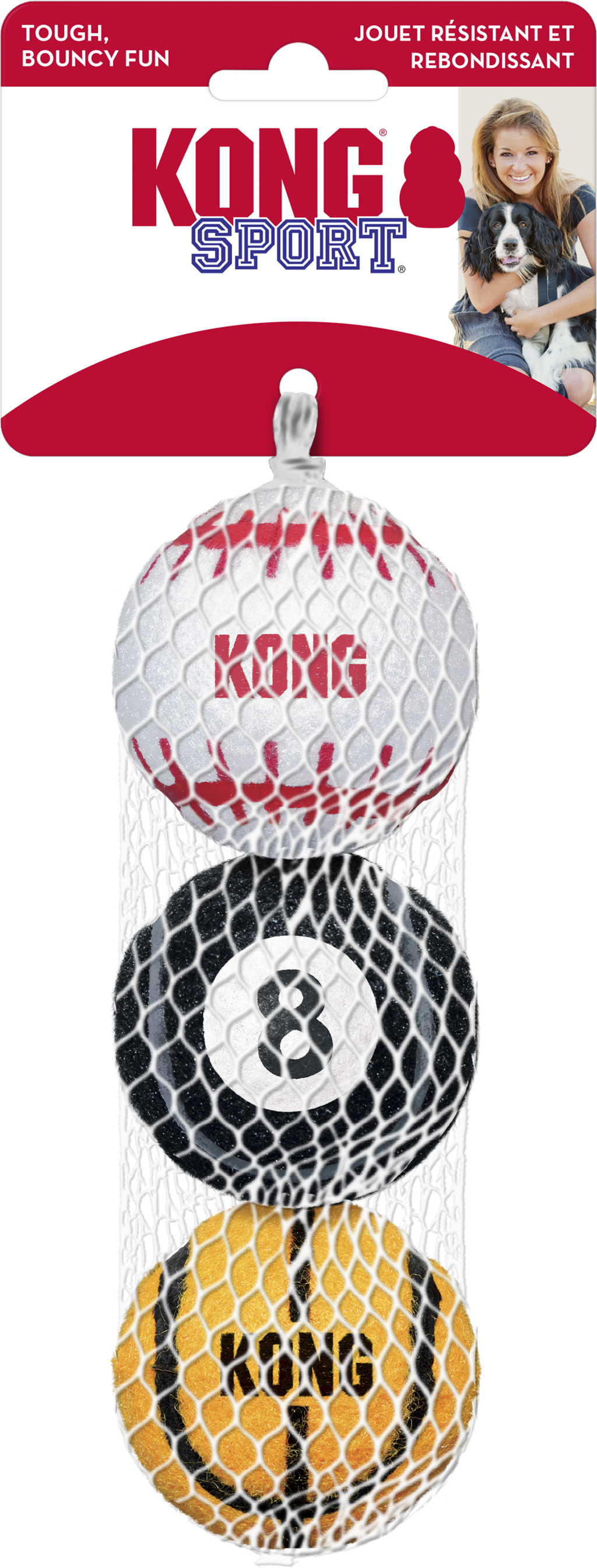 Sport Balls KONG® so izdelane iz debele, trpežne gume, odbijajo visoko in letijo daleč, točno tako, kot ima vaš pes rad. Žogice imajo posebej zasnovan, zobem prijazen premaz, ki spominja na teniško žogico, vendar ni abraziven.