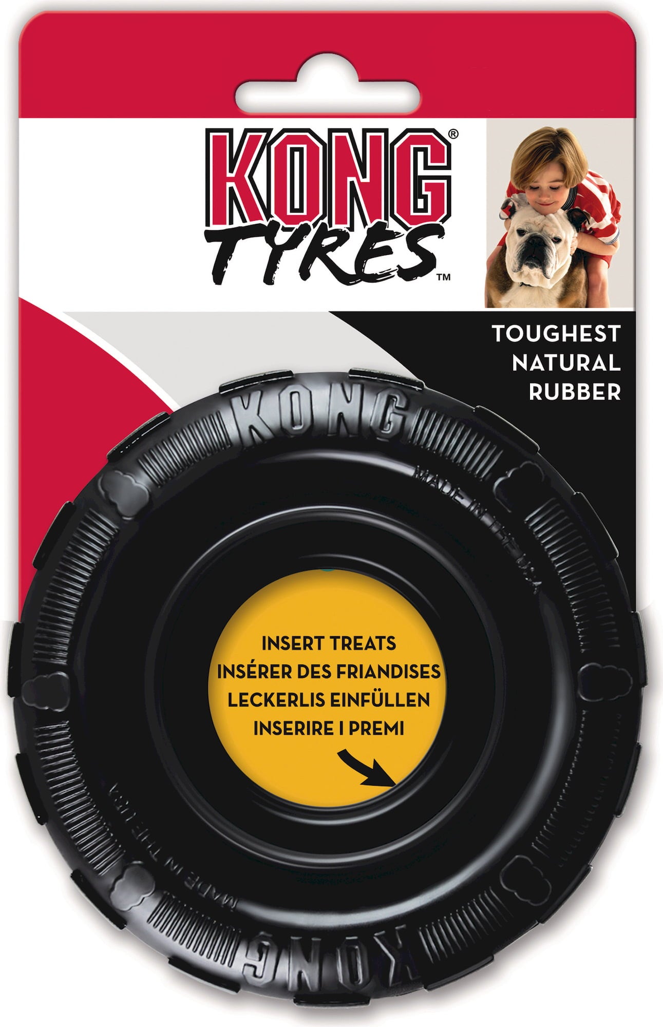 Interaktivna igrača KONG® Tyres™ ima debel zunanji profil iz prožnega in trpežnega naravnega kavčuka. Igrača je popolna za igre prinašanja, saj ima edinstveno oblikovane stranske stene, ki jih lahko napolnite z najljubšimi priboljški vašega psa.