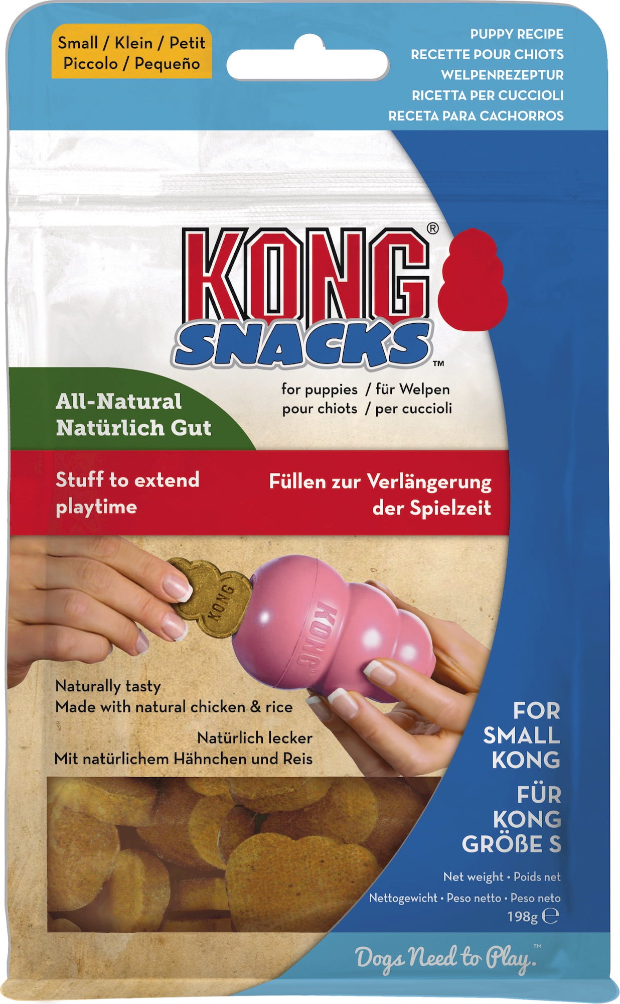 Ta okusen prigrizek je bil razvit za nagrajevanje mladičkov v fazi treninga. Okusen piščanec in aromatičen riž bosta vzbudila brbončice malih kosmatincev. Posebna oblika in velikost prigrizka sta zasnovani tako, da se popolnoma prilegata notranjosti pasje igrače KONG®.