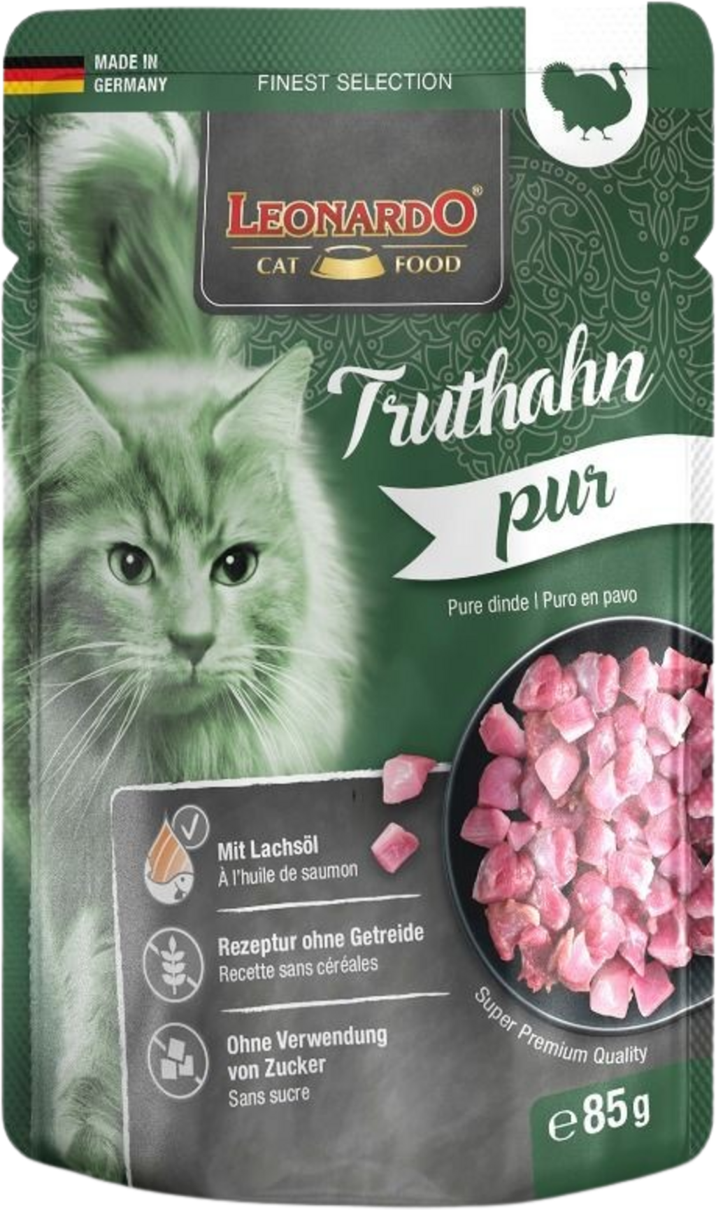 Sveže, sočno meso in okusna puranja drobovina naredijo to slastno mokro hrano pravi kulinarični vrhunec za mačje gurmane! Skrbno izbrane sestavine so kuhane in oplemenitene z visokokakovostnim lososovim oljem. Brez žitaric in sladkorja ter izdelano v Nemčiji.