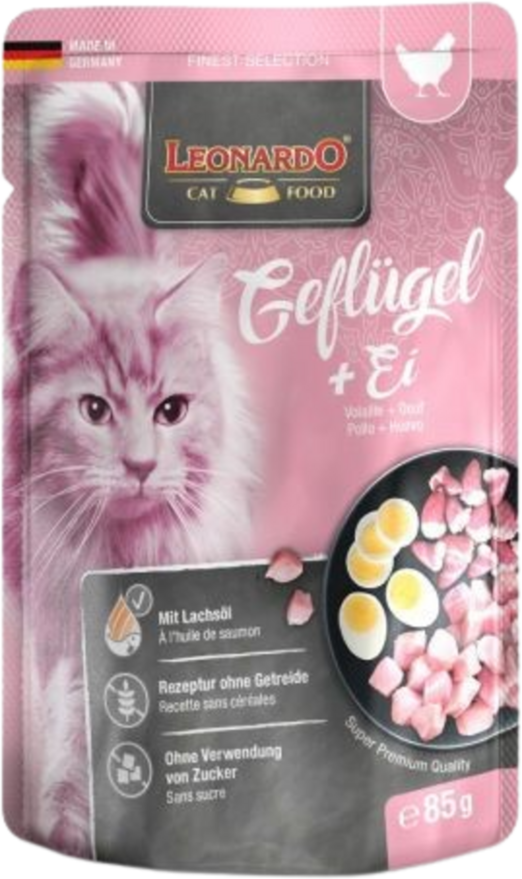 Sočno meso in okusno drobovino oplemenitijo okusna jajca in vsak obrok spremenijo v pravi kulinarični vrhunec! Skrbno izbrane sestavine so pakirane v porcijskih vrečkah in oplemenitene z dragocenim lososovim oljem. Sanje za vse mačke!