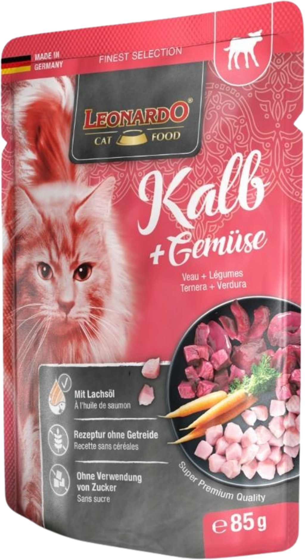 Sočno meso in okusna telečja in perutninska drobovina so oplemeniteni z okusnim korenčkom in vsak obrok spremenijo v pravi kulinarični vrhunec! Skrbno izbrane sestavine so pakirane v porcijskih vrečkah in oplemenitene z dragocenim lososovim oljem. Sanje za vse mačke!