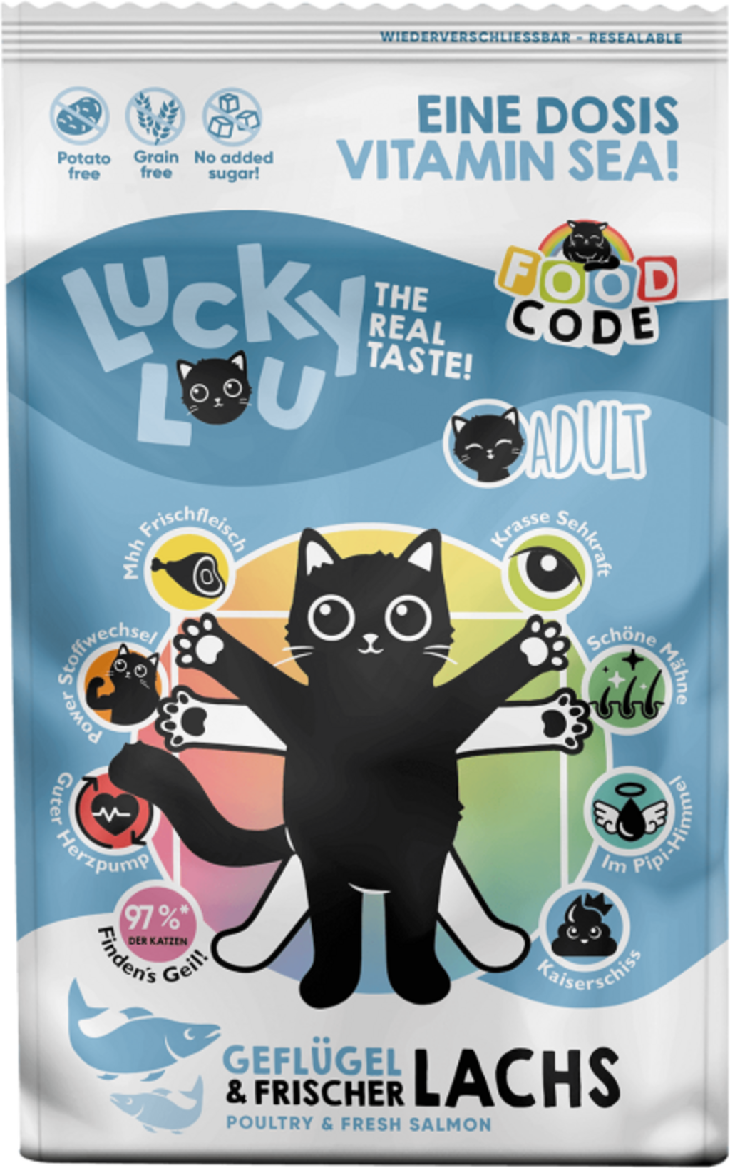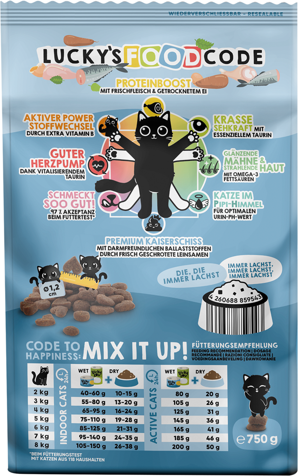 Lucky Lou Food Code je vrhunska suha hrana, saj ni le neustavljivo hrustljava in okusna, temveč vaši mački zagotavlja tudi dragocene hranilne snovi na starosti primeren način. Uravnotežena receptura te suhe hrane, ki jo je navdihnilo popolno razmerje Vitruvijevega človeka Leonarda da Vincija, ponuja 8 koristi na sorto in vašo mačko celostno razvaja.