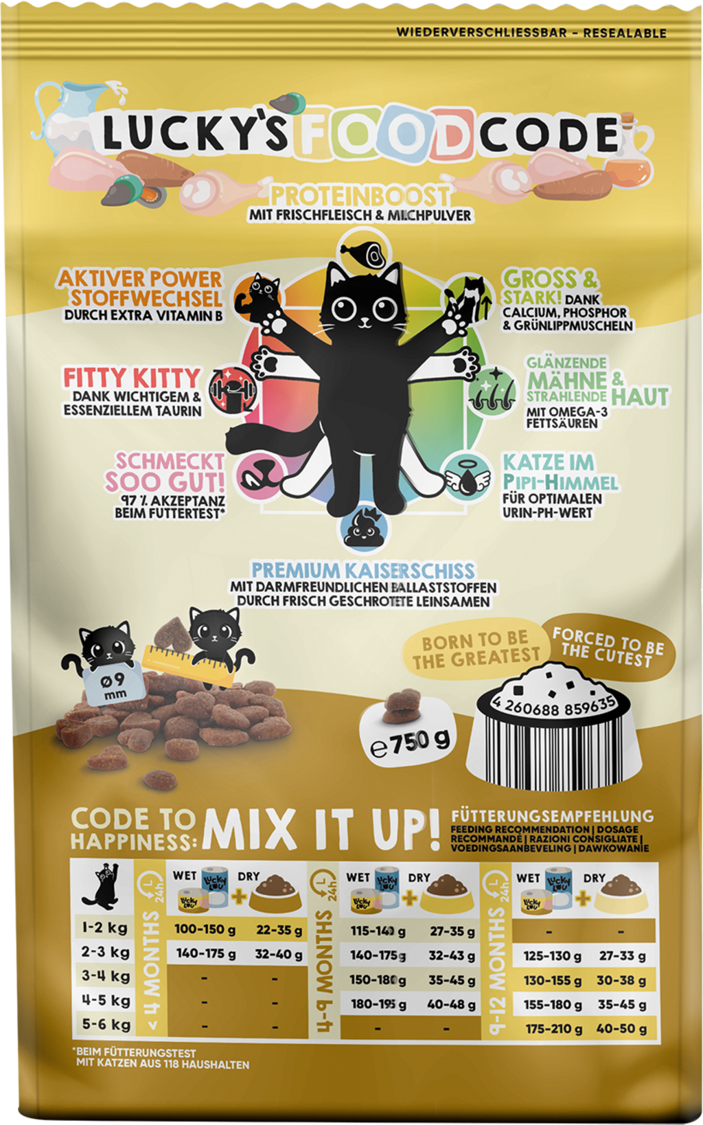 Lucky Lou Food Code je vrhunska suha hrana, saj ni le neustavljivo hrustljava in okusna, temveč vaši mački že od samega začetka zagotavlja dragocene hranilne snovi. Uravnotežena receptura te suhe hrane, ki jo je navdihnilo popolno razmerje Vitruvijevega človeka Leonarda da Vincija, ponuja 8 koristi na sorto in vašo mačko celostno razvaja.